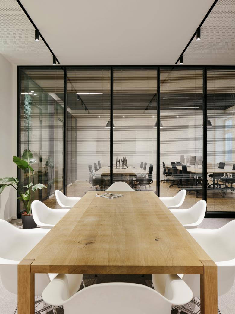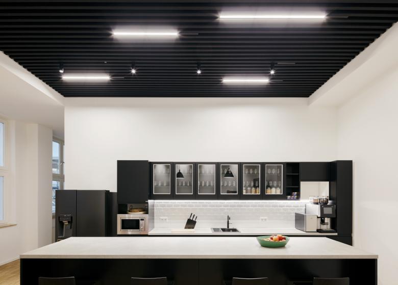„Begegnungszonen gehören zur Company-Kultur von Evernest und ziehen sich als roter Faden durch die gesamte Planung“, sagt Bastian Bechtloff und verweist damit etwa auf die stilvoll gestalteten Sitzecken und integrierten Couches mit extra hohen, abschirmenden Rückenlehnen. Konferenzräume mit gläsernen Bürotrennwänden und innen liegenden dunklen Jalousien bieten auch in diesem Gebäudeteil ausreichend Privatsphäre. Weil Teamspirit eine maßgebliche Rolle im expandierenden Unternehmen spielt, kommt folgerichtig auch der offen gestalteten Küche mit großzügigem Tresen, diversen Hochtischen und einem Spielautomaten eine wichtige Bedeutung zu. Wie überall wurde im Küchenbereich Eichenindustrieparkett verwendet. Möbel und Wohnaccessoires auf der gesamten Fläche stammen von namhaften Herstellern wie Vitra und USM. Effektvoll integrierte Deckenspots und Hängelampen im Industrie-Look wurden vom belgischen Hersteller Delta Light kreiert, der weltweit für seine innovativen und subtilen Beleuchtungskonzepte bekannt ist. Farblich dominieren ganz klar Schwarz und Weiß – ein deutlicher Bezug auf das pure, cleane Logo von Evernest. „Jedes noch so kleine Detail fügt sich unangestrengt ins Gesamtbild ein. Mit einer Ausnahme“, sagt Bastian Bechtloff und deutet dabei auf den einzigen „Exoten“: Eine gusseiserne Glocke, die bei erfolgreichen Deals geläutet wird.