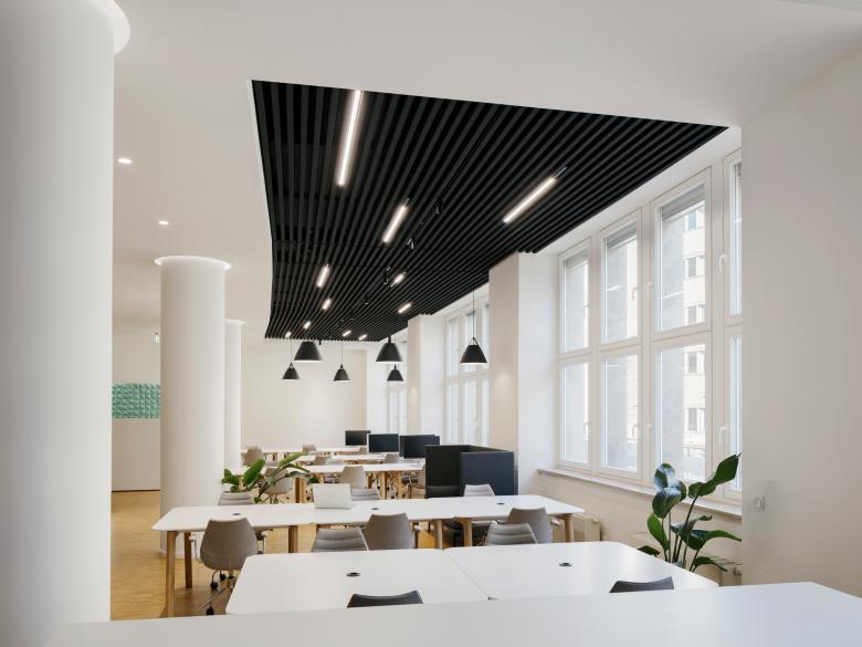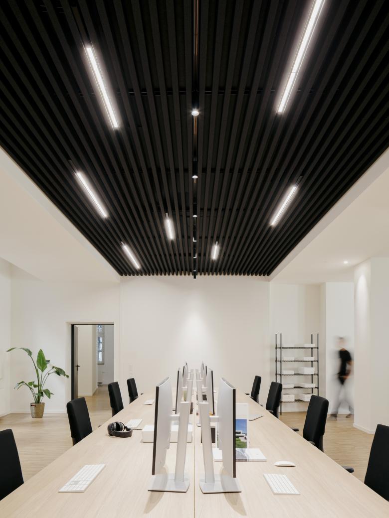 Bei der Planung war der …. -Jährige vor allem darauf bedacht, die Originalstruktur des leicht gebogenen Raumes zu erhalten. Weiße Deckenelemente in verschiedenen Höhen im Kontrast zu schalldämpfenden schwarzen Filzlamellendecken zonieren den Bereich. Über einen schmalen Flur gelangt man auf die zweite Bürofläche. Die Decke, welche zum Licht hin höher wird, lenkt dort den Blick automatisch auf die historischen und mit Sprossen unterteilten Rundbogenfenster, die das einladende Ambiente maßgeblich prägen.
