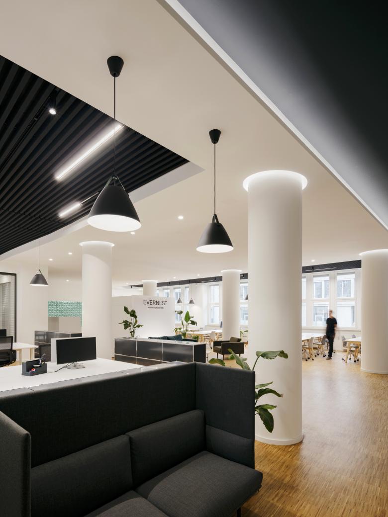 Zwei separate und durch einen Gang miteinander verbundene Großräume bieten auf der einen Seite Platz für ein Team aus selbstständigen Maklern und auf der anderen für das Backoffice sowie die Technik-Abteilung von PropTech-Unternehmen Evernest, das im November 2019 gegründet wurde. Auch ohne klassischen Empfangstresen fühlt sich der Besucher auf der ersten Bürofläche automatisch willkommen. Woran das liegt? Die klassische Aufteilung mit Mittelgang und Shared-Desk-Arbeitszonen zu beiden Seiten wird immer wieder gekonnt aufgebrochen – sei es durch Sitzecken oder durch Rückzugs- und Telefonboxen, die sich ganz selbstverständlich einfügen. „Ein Gefühl von Wohnlichkeit dominiert klar über die klassische Büro-Atmosphäre“, sagt Bastian Bechtloff, der seit 2011 als freischaffender Architekt in Hamburg tätig ist. Dies liege besonders an baulichen Elementen wie den charakteristischen Säulen: Die alten gußeisernen Deckenstützen, aus Brandschutzgründen mit Gipskarton verkleidet, werden mit einem warmen Lichtkranz dezent in Szene gesetzt. „Die einzelnen Zonen werden zwar voneinander abgegrenzt, sind aber trotzdem durchlässig.“