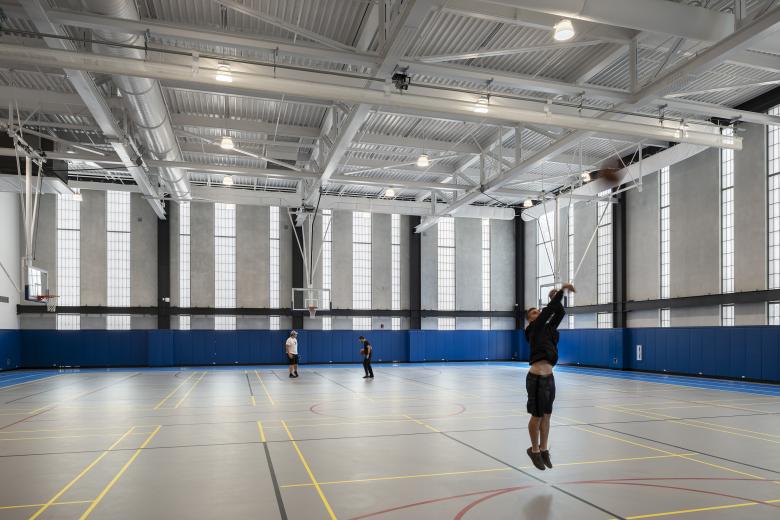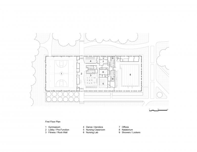 The Health and Wellness Center is a 45,000-square-foot academic and recreation facility that contains teaching spaces for the Department of Nursing and Physical Education, as well as recreation spaces for students, faculty, and the Eastern Long Island community. Inspired by the East End Long Island Pine Barrens where this campus is set, the Center for Health and Wellness’s custom-fabricated precast concrete panels and glass façade are modeled after abstracted representations of pine bark to highlight the importance of the natural environment in establishing the unique architectural character of Suffolk Community College and to create a building that evokes the neighboring stand of pine trees along the southern edge of campus. The Health and Wellness Center extends the existing campus plan by creating a second campus quadrangle—the new recreation quad—that will house a future multi-purpose field. The center is organized around a sun-drenched double-height lobby and soaring rock-climbing wall that leads to a fitness room and locker rooms and is flanked by a gymnasium and a natatorium for recreation and NCAA competitions.