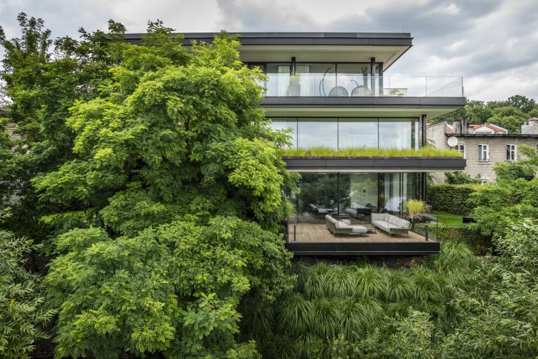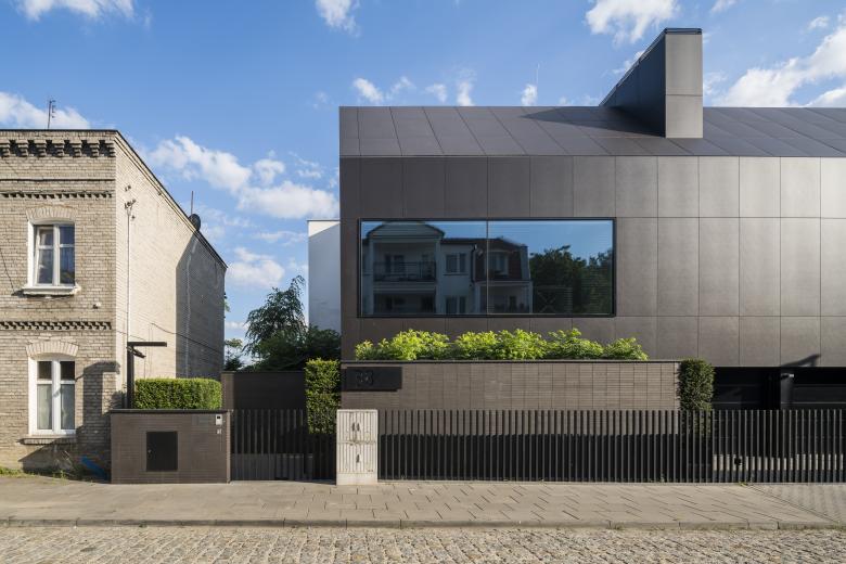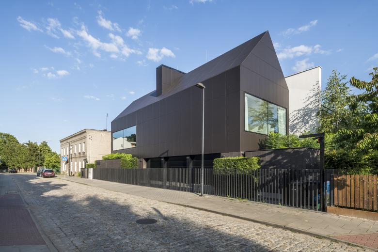 Das Herba House hat zwei Gesichter: zur Straße hin ist es geschlossen und zum Fluss hin offen. Auf der Straßenseite wurde es mit schwarzen Fassadenplatten aus Faserzement verkleidet, während der südliche Teil des Hauses aus Terrassen besteht, die sich zum Fluss hin öffnen und wie eine Kaskade über den Hang „fallen“. Das Gebäude steht in Torun (Polen).