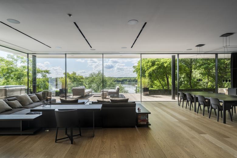 Alle Schlafzimmer und Gemeinschaftsräume, der offene Wohn- und Essbereich und die Küche öffnen sich nach Süden zum Fluss hin, der unter Naturschutz steht. Diese Räume sind von natürlichem Licht durchflutet. Sucharski lag daran, die Grenzen zwischen Innen- und Außenbereich zu verwischen, indem er große verglaste Schiebetüren einbaute, die sich zu den Terrassen öffnen. Darüber hinaus sind die Böden sowohl im Innen- als auch im Außenbereich mit Holz verkleidet, wodurch die Grenze zwischen Innen- und Außenbereichen nahezu verwischt wird. Ein großzügiger Außenwohnbereich auf der Terrasse im Erdgeschoss kragt dramatisch über den Hang aus. Die natürliche Landschaft und Aussicht auf den Fluss wurde durch die Art der Bepflanzung und verglaste Balustraden in die Wohnbereiche des Hauses eingeladen.