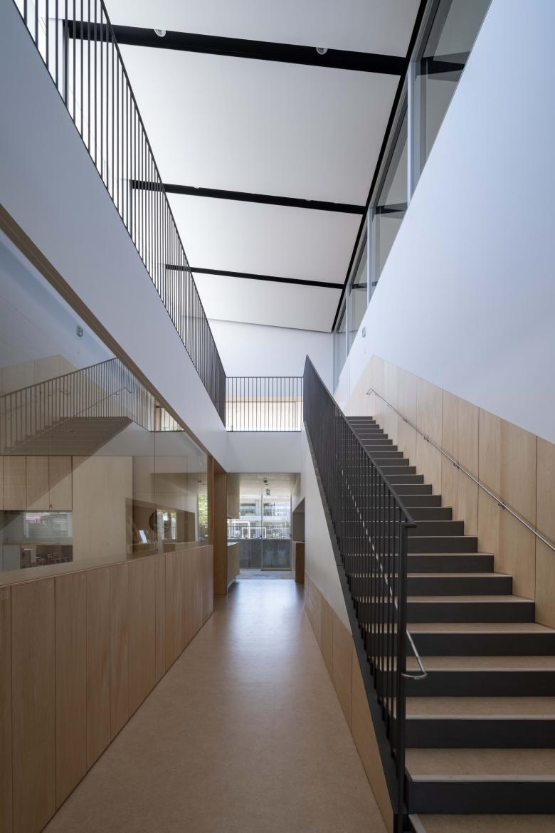 The east wing of the kindergarten building has a hall that can be used as a gymnasium with balcony seating on the second floor, a multipurpose room, an audio-visual room, and a library corner facing the rooftop garden; the west and north wings have nursery rooms; and the staff room is on the first floor of the north wing overlooking the entire school garden. The kindergarten building surrounds the school garden.