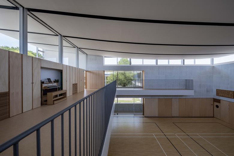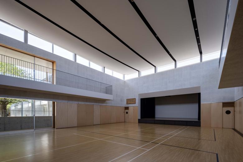 The second-floor exterior hallway surrounding the kindergarten garden is used as a spectator seating area during sports events and festivals. On the first floor of the west wing, there is a pilotis that can be used as a shelter from the strong summer sun and as a playground on rainy days.