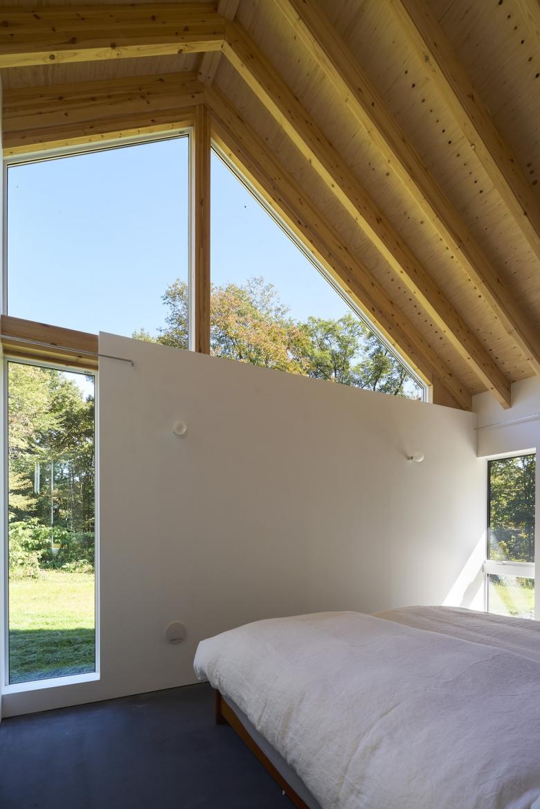 最小限の住宅でありながら、大きなデッキと自然へと開かれた構成により、空間は外へと豊かに広がっている。
