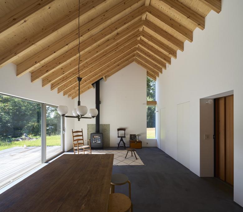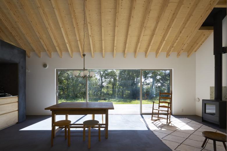家庭菜園や庭の手入れ、雪かきなどに必要な道具を収納できるストレージスペースも設け、外部からは一見扉に見えない勝手口も用意している。温泉地に近い立地のため浴槽は設けず、シャワー室のみとした。薪ストーブは、薪さえあれば電気やガスに頼ることなく家全体を暖めてくれる。