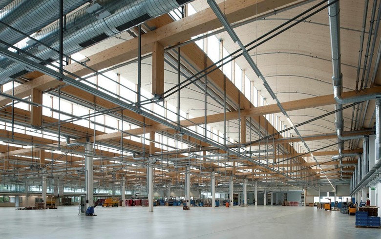 Der Neubau beinhaltet Produktions- und Logistikflächen, ein vollautomatisiertes Paletten- und Behälterlager sowie peripher angeordnete Support- und Büroflächen. Während das 30m hohe Hochregallager als schwarzer, vertikal orientierter Kubus von der Kulisse des Auwaldes optisch geschluckt wird, präsentieren sich die shedüberwölbten Prozessbereiche als metallisch, schuppiger Monolith. Das Produktionsgebäude versteht sich als Analogie zum Metallrohling, der durch den subtraktiven Zerspanungsprozess seine Form erhält.