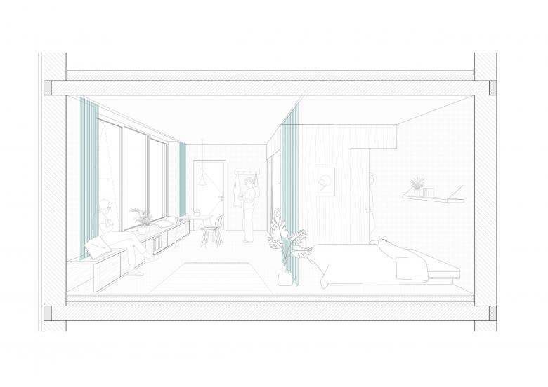 Die drei Wohneinheiten verfügen jeweils über denselben Grundriss: ein Einraum, welcher durch einen rückwärtigen Einbau für Bad und Ankleidebereich mit Stauraum unterteilt wird.