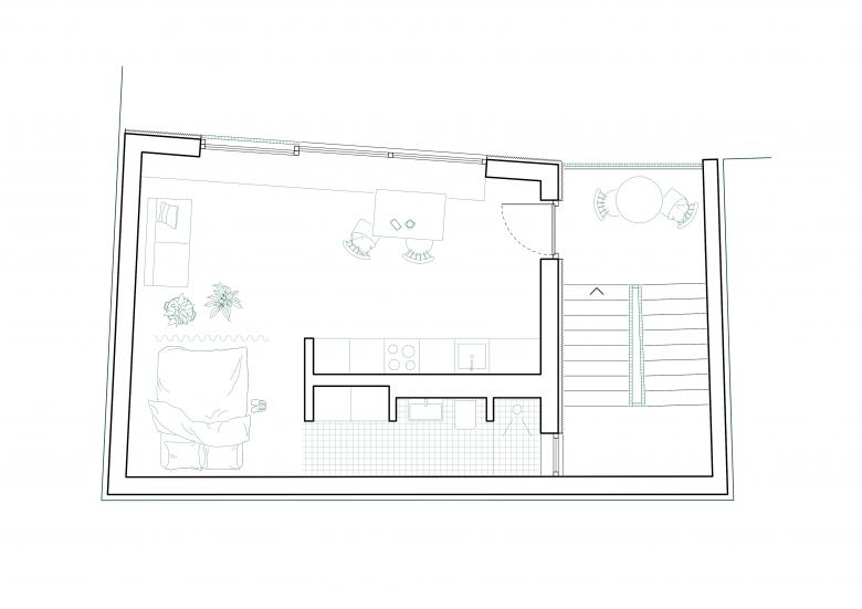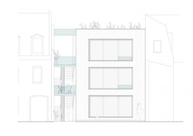 Das Gebäude fügt sich in seiner Kubatur in den von drei Seiten umbauten Bauplatz ein. Auf dem Grundstück entsteht somit zwischen bestehendem Vorderhaus und neuem Hinterhaus ein Hof, der von allen Bewohner*Innen genutzt werden kann.