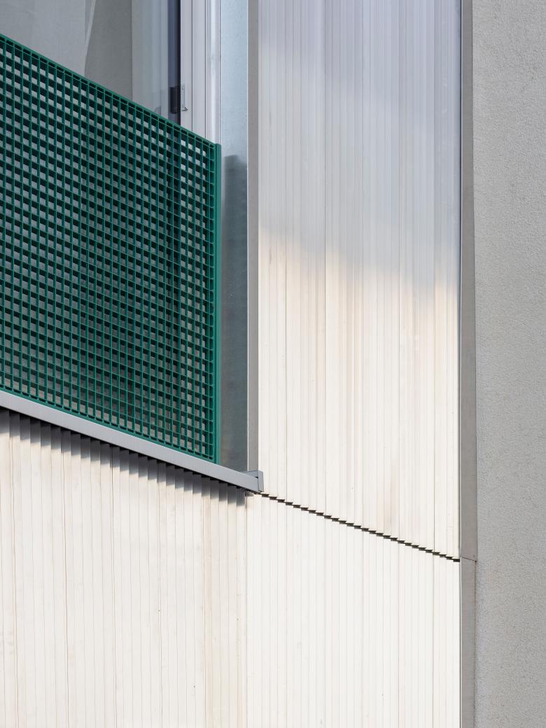Das Gebäude erhält eine Fassadenverkleidung aus blankem Aluminium in gezackter Form, welche es stark vom Kontext absetzt und zu einem eigenständigen Baukörper werden lässt. Diese helle Fassade strahlt auf den Innenhof ab und gibt ihm zusätzliche Helligkeit. Gleichzeitig nimmt sie aber auch die Farben der Umgebung und des Himmels auf und erscheint jeden Tag etwas anders.