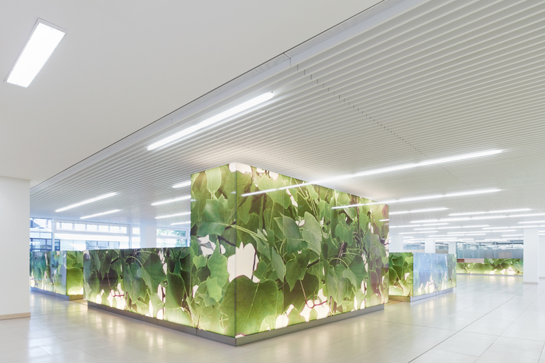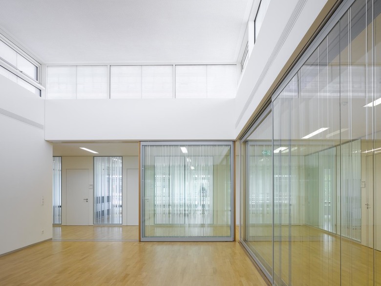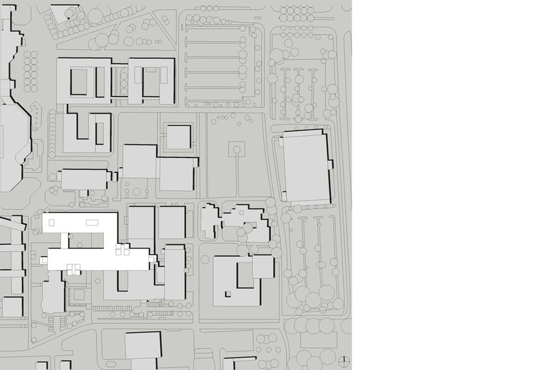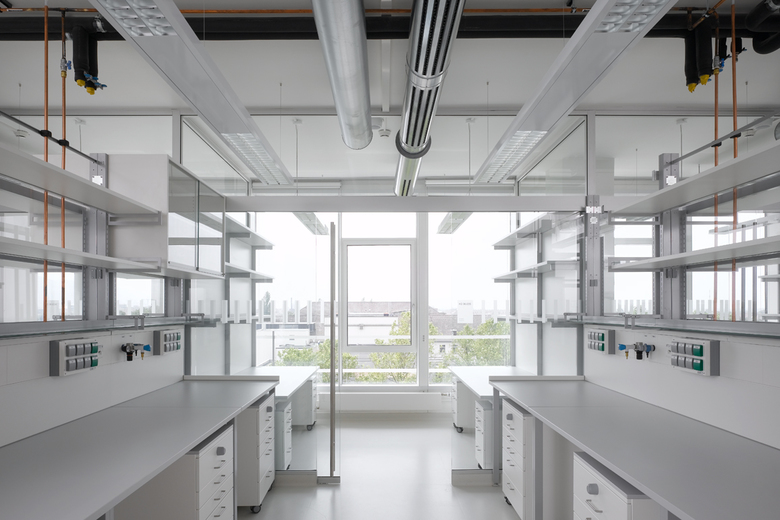 Die ursprünglich dreibündige Grundrissorganisation der Laborbereiche ist nun zweibündig. Dadurch entstehen große Raumtiefen, wodurch die natürliche Belichtung im Labor gewährleistet wird. Die neu erstellten Verwaltungsräume sind mit verglasten Schiebewänden offen konzipiert. Die Kommunikationszone mit Besprechungsraum, Bereichsbibliothek und Teeküche dient als Treffpunkt auf dem Stockwerk und schafft einen Ort der Diskussion und Besinnung. Das Foyer im Erdgeschoss wurde „frei geräumt“ mit Blick in den Innenhof.