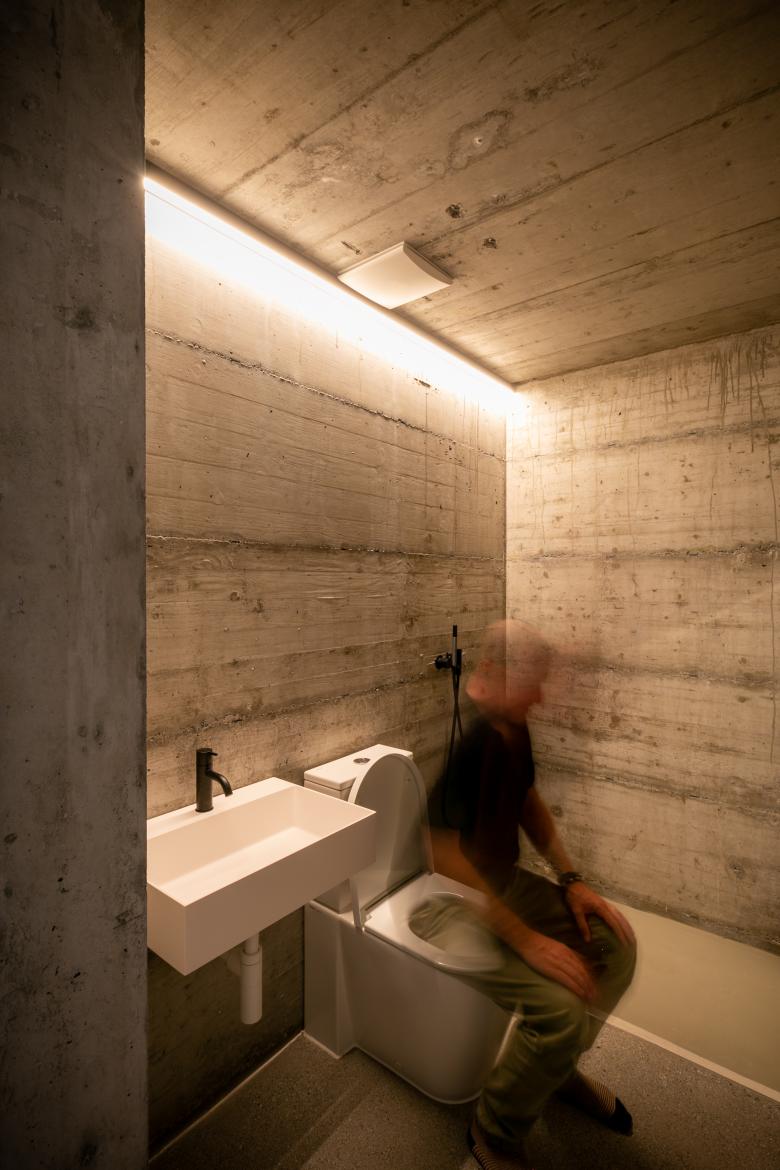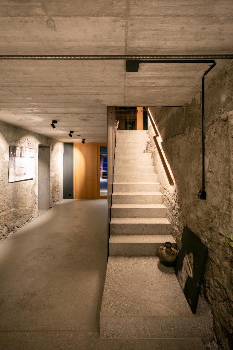 Das alte Steinmauerwerk, sowie die vorhandene Dachkonstruktion der Scheune waren fundamentale Elemente in der Projektplanung, welche im Umbau stets berücksichtigt wurden. Diese Materialien wollte man erhalten, freilegen und mit naturnahen und rohen Materialien ergänzen und aufwerten. Somit wurde der Bestand mit Sichtbeton, massiven Lärchendielen, dunkler Holzschalung und Kupferblech ergänzt.
