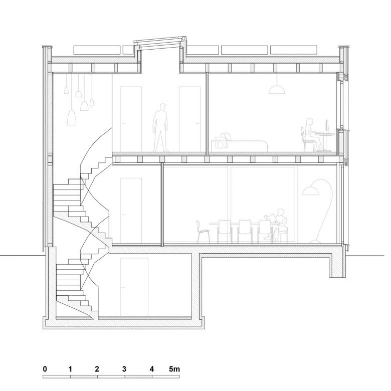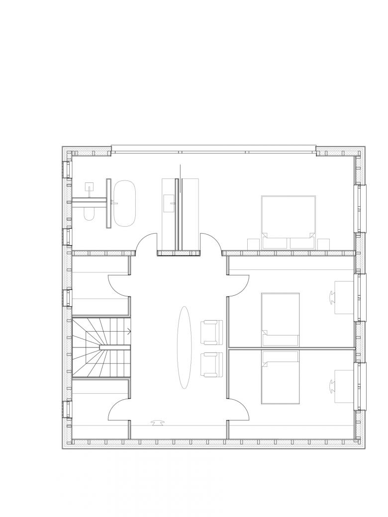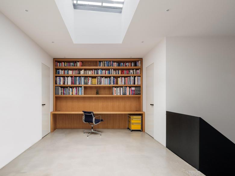 Im Obergeschoss befinden sich drei Schlafzimmer mit Bad und Garderoben- und Waschkammer. Anstelle eines klassischen Flurs führt die Treppe zu einem introvertierten, hellen Raum mit Oberlicht, der als zweiter, ruhigerer Wohn- und Arbeitsraum dient und weiteren Raum für museal von oben beleuchtete Kunstobjekte bietet. So wird aus einer Verkehrsfläche ein vielseitig nutzbarer Raum mit Aufenthaltsqualität, der dem Gebäude zusätzliche Funktionalität und eine besondere Atmosphäre verleiht. Die Kinder haben sich diesen Raum auch als Liebelingsort für Hausaufgaben angeeignet.