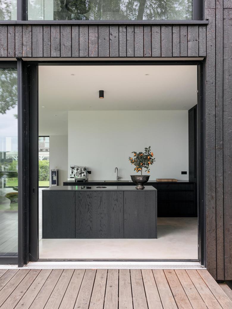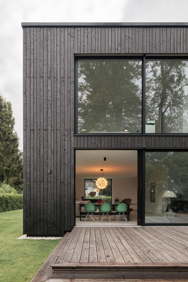 Das Materialkonzept ist minimalistisch und setzt auf natürliche und nachhaltige Baustoffe. Die Außenhaut besteht aus schwarzem Holz, das mit der Shou-Sugi-Ban-Technik – einer traditionellen Methode der gezielten Verkohlung – konserviert und veredelt wurde. Unterschiedlich breite Holzbretter erzeugen eine für das Auge feine angenehme und ausgewogene Struktur.