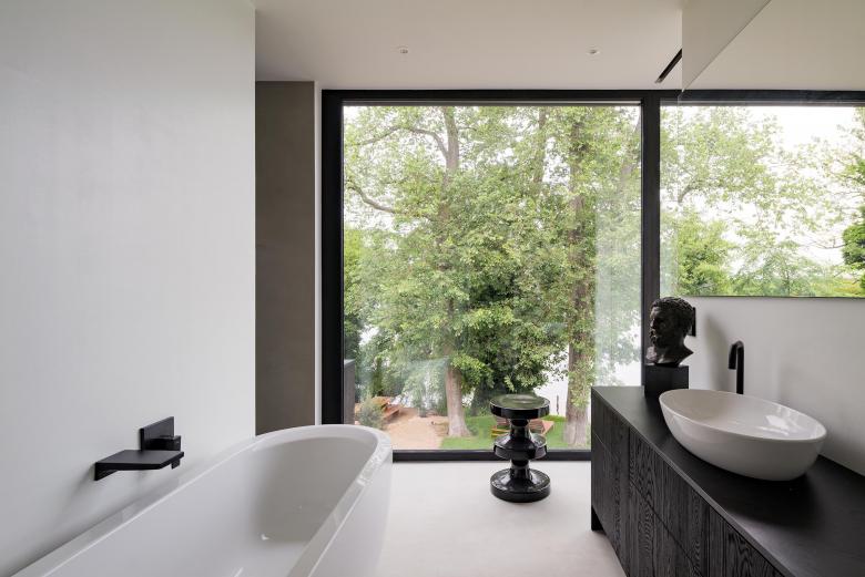Im zum See orientierten Elternschlaf- und Badezimmer wiederholen sich die Panoramafenster. Das Badezimmer ist durch eine Schiebetür direkt mit dem Schlafzimmer verbunden. Ist die Tür geöffnet sind beide Räume fließend verbunden, und der Ausblick über die großzügige Fensterfront in ihrer gesamten Länge erfahrbar.