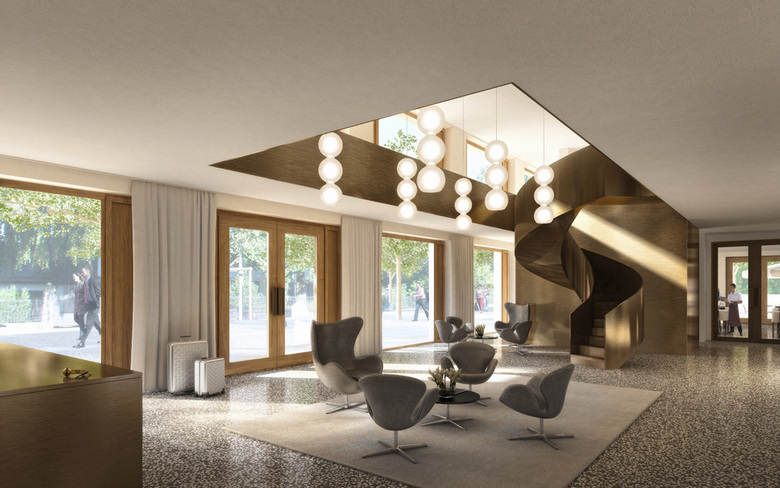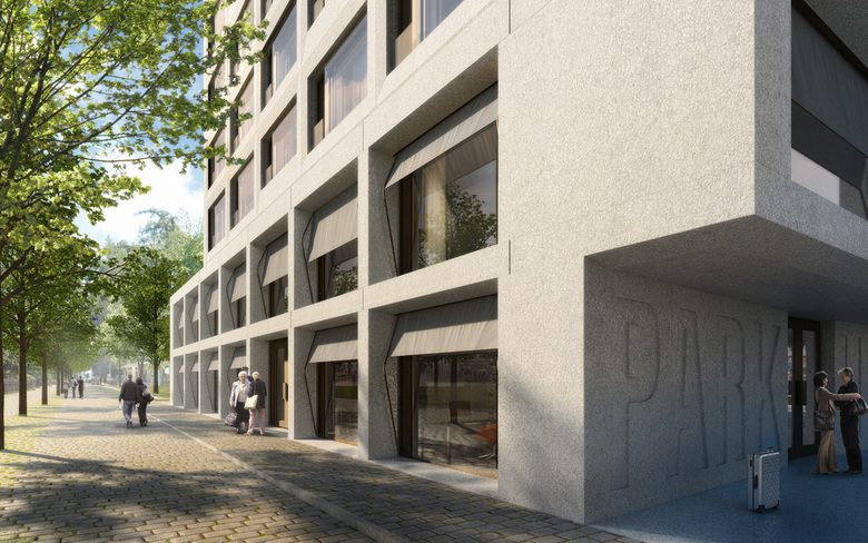 Das neue Seminarhotel Park mit seiner dreigliedrigen kubischen Stapelung besetzt das nördlichste Feld des Parkes und setzt sich gleichzeitig satt an die Seeallee.