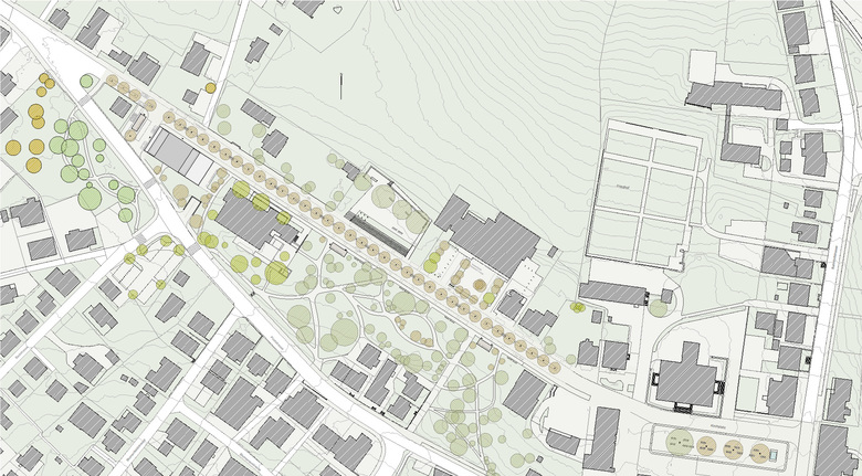 Die Seeallee auf der tektonischen Kuppe zwischen Kirchplatz und Dorfeinfahrt wird zur Lebensader des kultivierten „Seminar“-Tourismus. Die Reduktion respektive die Befreiung vom motorisierten Verkehr erlauben eine radikale Neuinterpretation dieser Wegachse hin zu einer breiten raumverbindenden Promenade durch den offenen Landschaftspark.