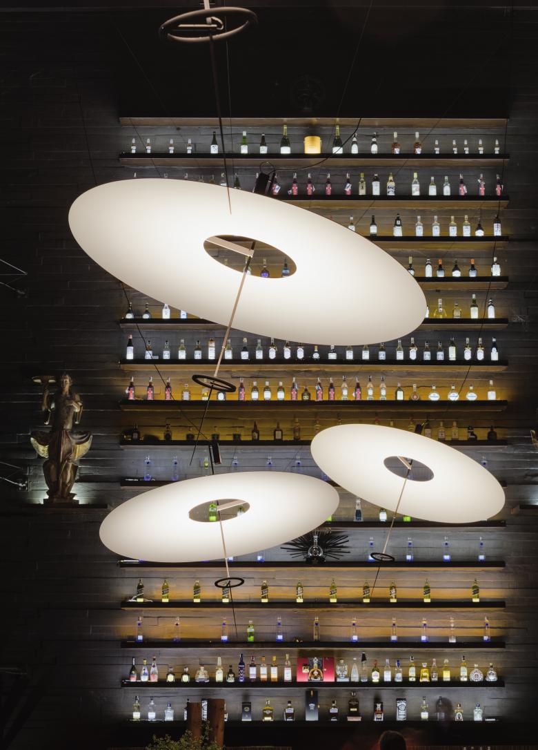 Im Hotel Unique in Sao Paulo platzierten Ingo Maurer und sein Team fünf Flying Disc über Lobby und Bar. Der bestehende Raum wurde dadurch aufgewertet. Das Arrangement lenkt die Aufmerksamkeit der Besucher vom Sitzbereich in der Mitte der Lobby bis zum Ende des Raumes, der vorher nur wenige Gäste anzog. Das völlig blendfreien Licht bietet den Hotelgästen eine entspannenden Atmosphäre, in der sie die Räumlichkeiten genießen können. Während der Installation war Ingo Maurer und Team im Hotel Unique anwesend und leitete die Platzierung der Lichtobjekte.