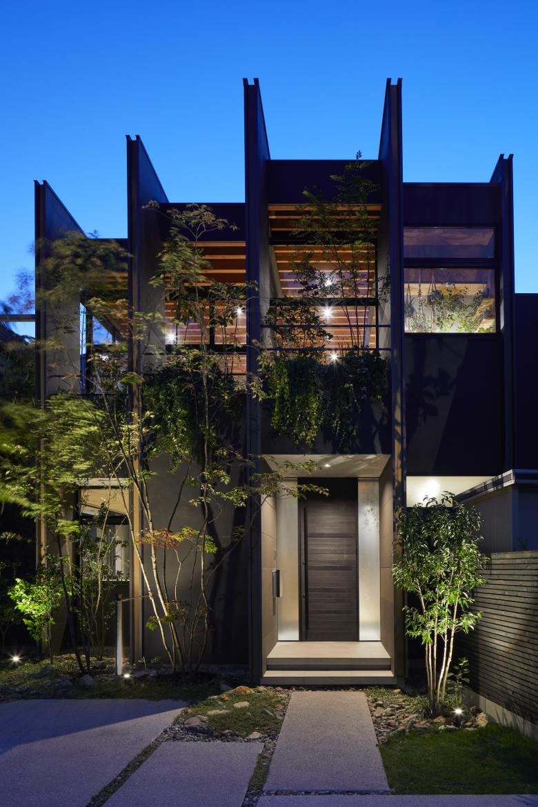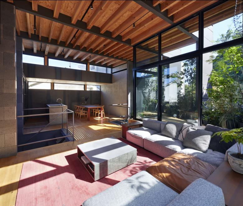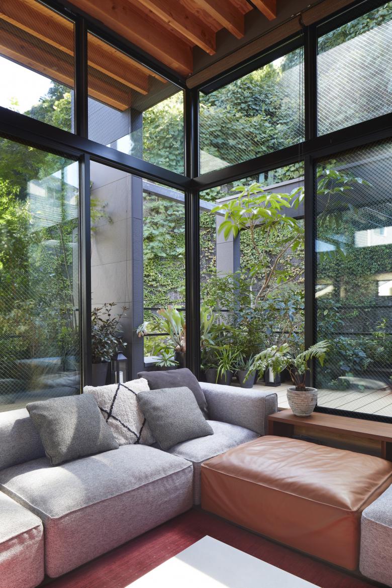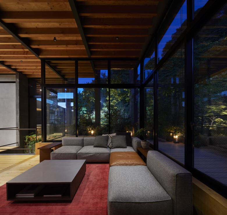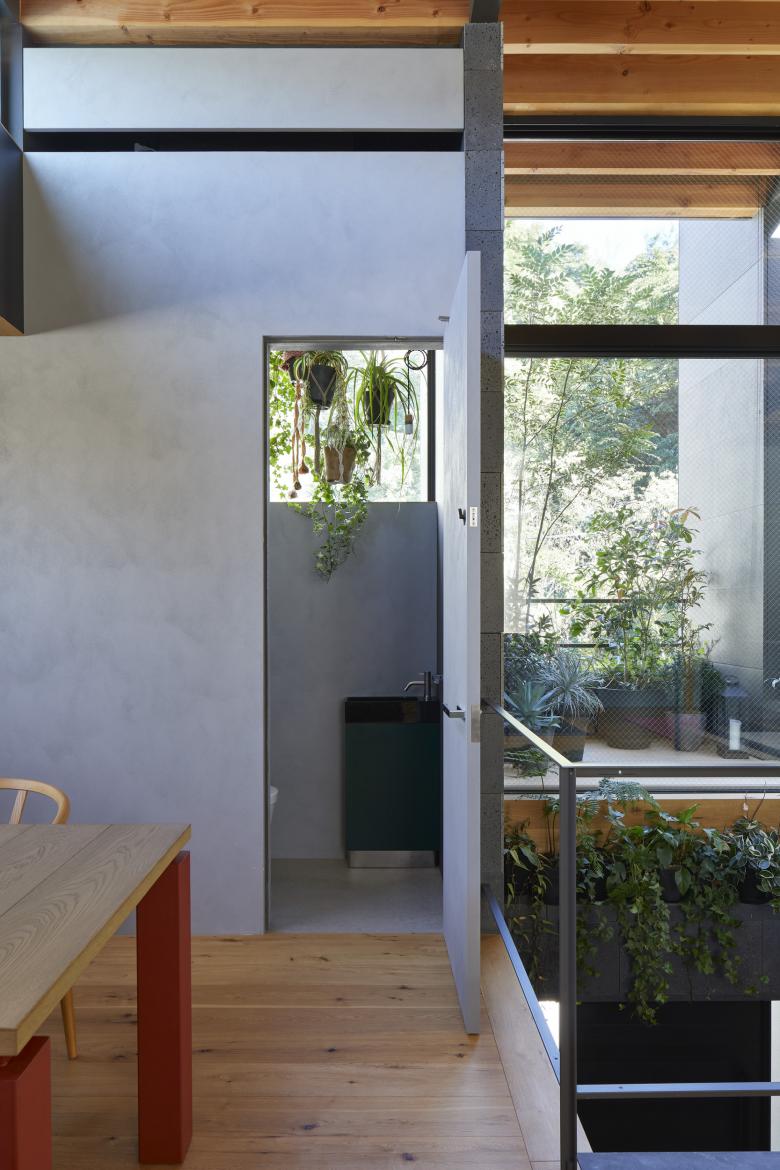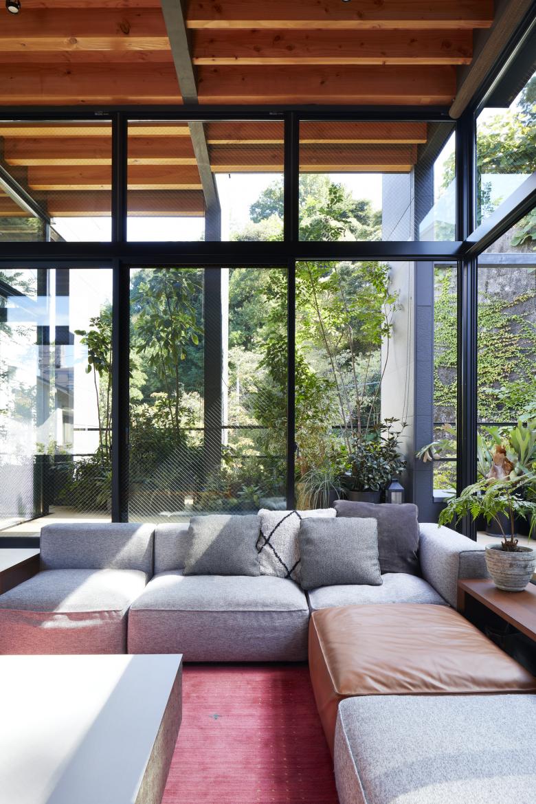 The second floor is the main family gathering space, and a semi-outdoor space filled with plants was defined as a "tsuginiwa," or garden that connects the environment and the architecture at the boundary between the interior and exterior. By setting the garden 4m above the ground surface, the garden overlaps horizontally with the lush greenery in the distance, creating a landscape with depth. The tangen garden is extended to the southeast to allow light to penetrate to the trees, creating a geese-path shape with different depths, and the bearing wall is placed in parallel to the garden to modulate the sunlight and the line of sight from the neighboring land. The exterior form of the building, which is intricate with the tangen garden, overlaps with the view to the southwest of Mt.