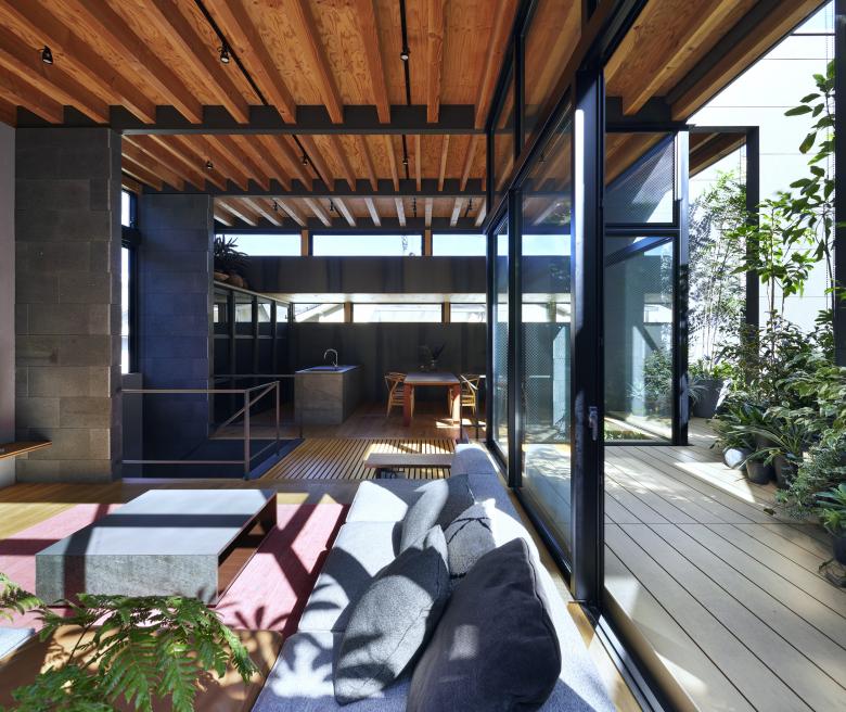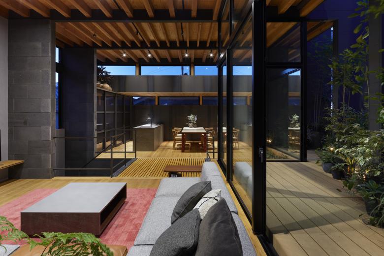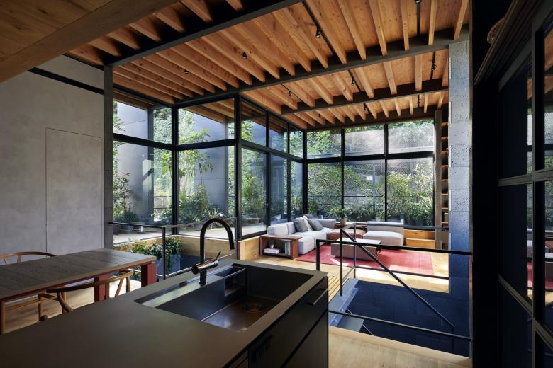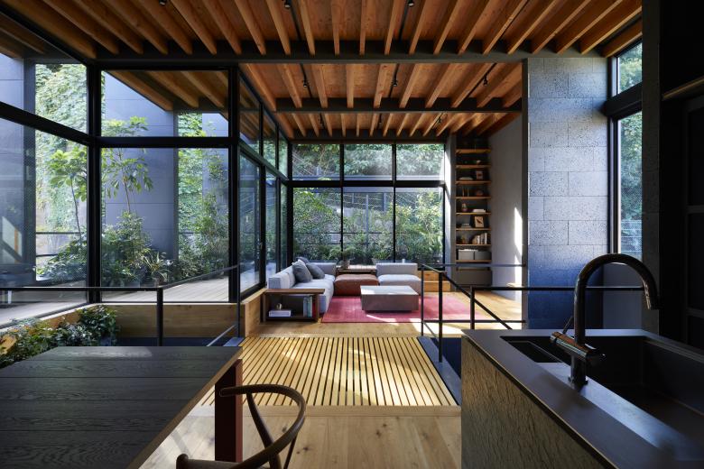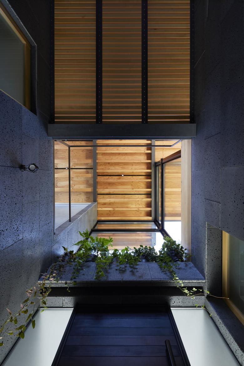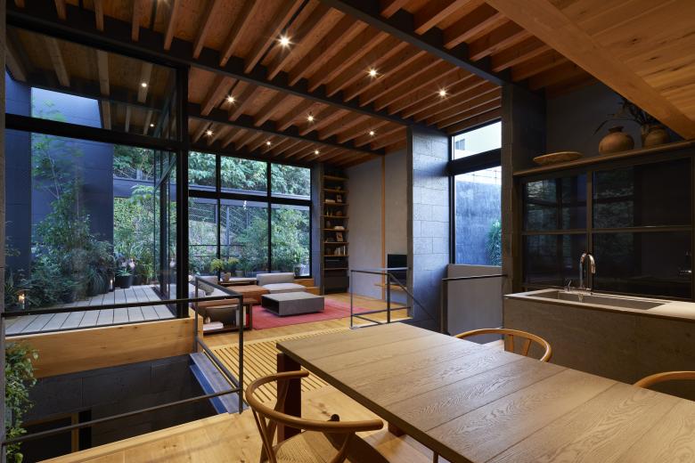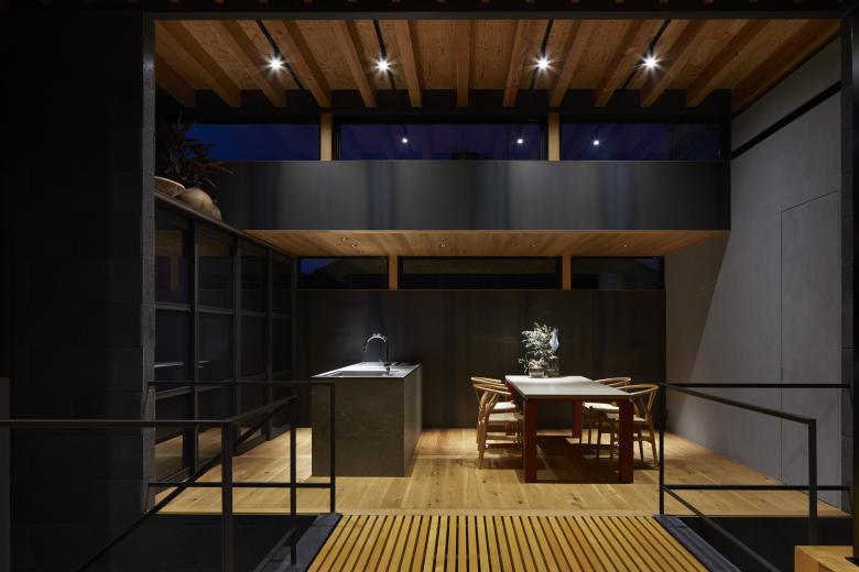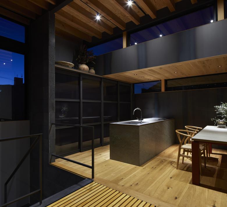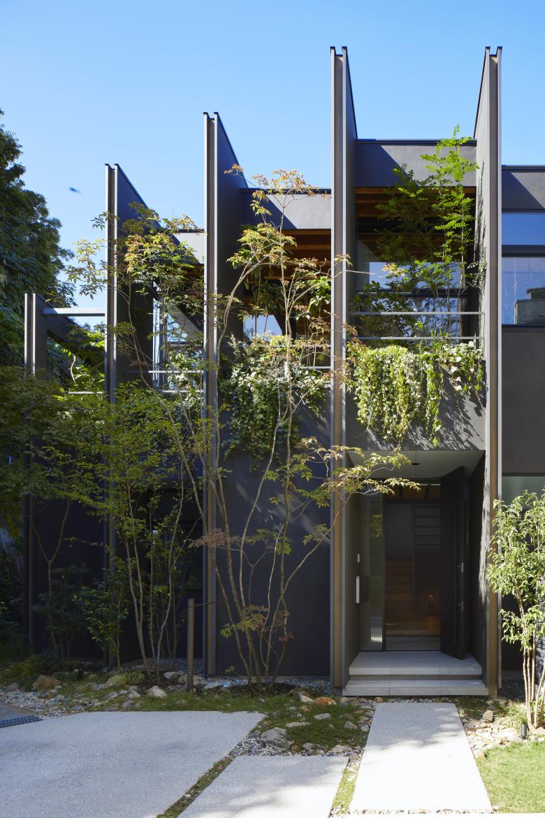 The second floor is the main family gathering space, and a semi-outdoor space filled with plants was defined as a "tsuginiwa," or garden that connects the environment and the architecture at the boundary between the interior and exterior. By setting the garden 4m above the ground surface, the garden overlaps horizontally with the lush greenery in the distance, creating a landscape with depth. The tangen garden is extended to the southeast to allow light to penetrate to the trees, creating a geese-path shape with different depths, and the bearing wall is placed in parallel to the garden to modulate the sunlight and the line of sight from the neighboring land. The exterior form of the building, which is intricate with the tangen garden, overlaps with the view to the southwest of Mt.