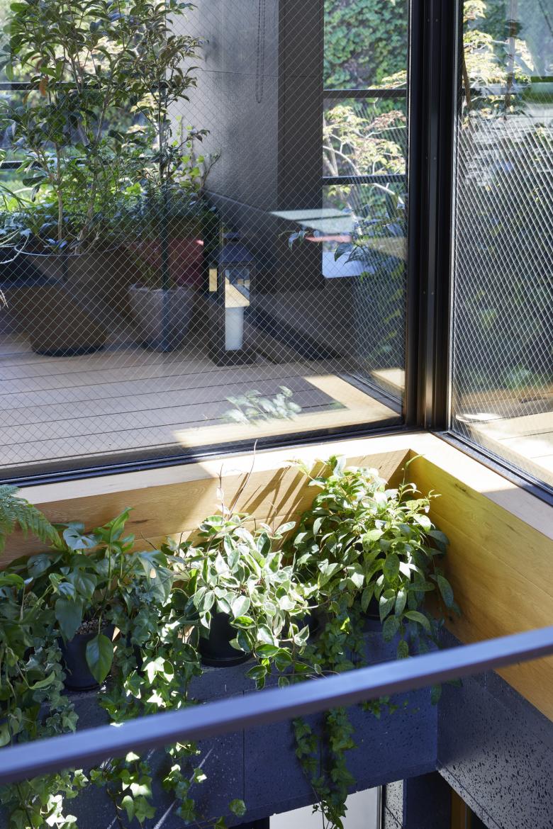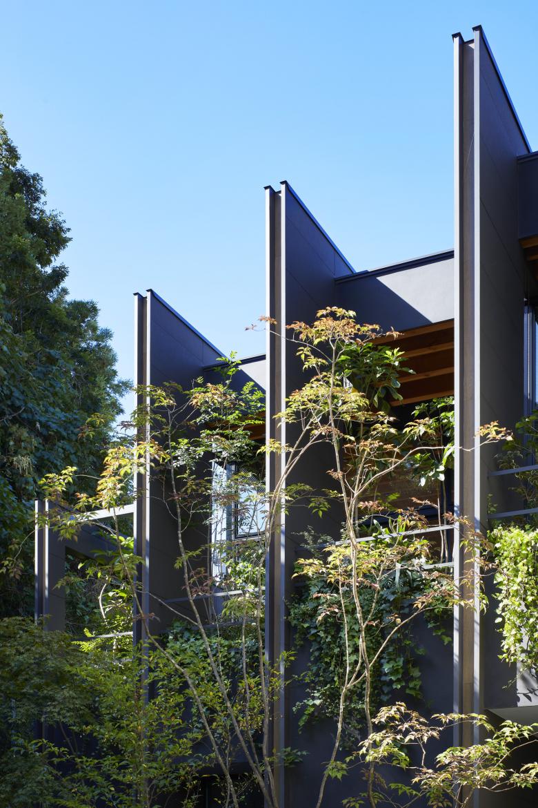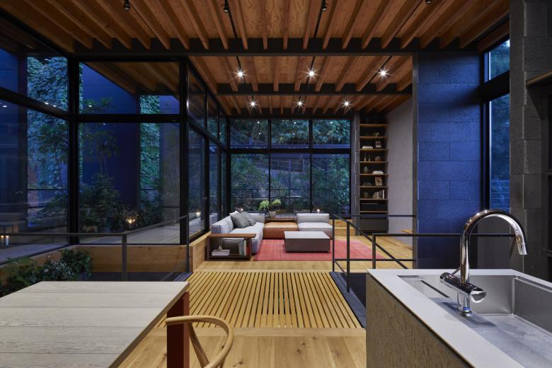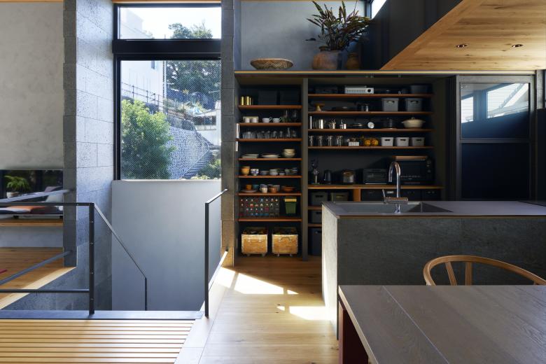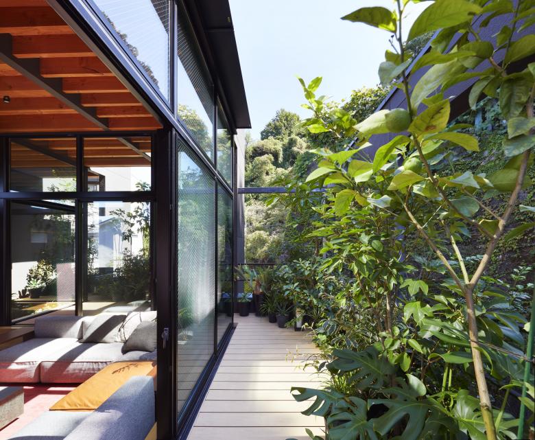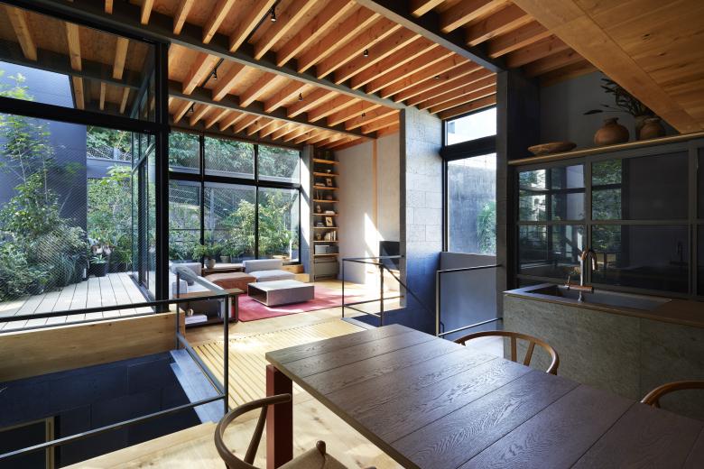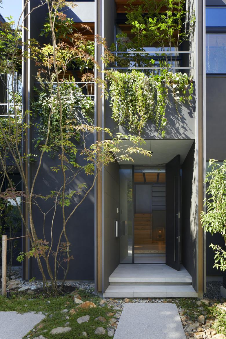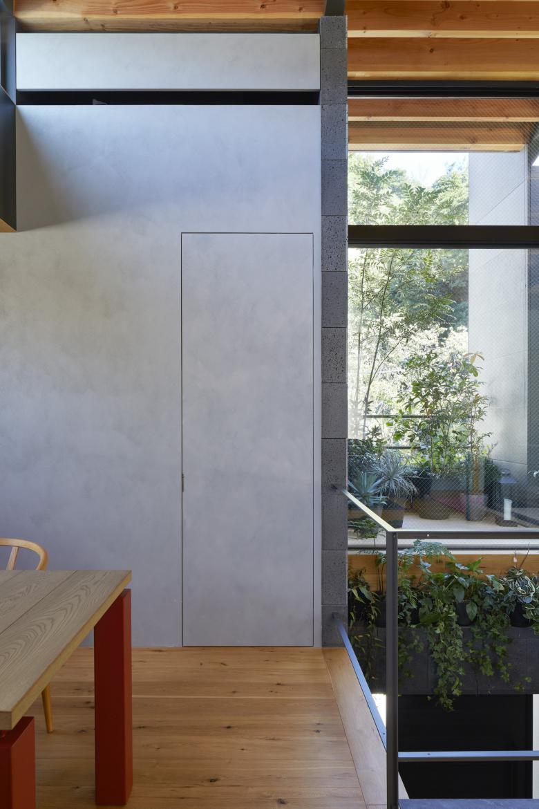 The second floor is the main family gathering space, and a semi-outdoor space filled with plants was defined as a "tsuginiwa," or garden that connects the environment and the architecture at the boundary between the interior and exterior. By setting the garden 4m above the ground surface, the garden overlaps horizontally with the lush greenery in the distance, creating a landscape with depth. The tangen garden is extended to the southeast to allow light to penetrate to the trees, creating a geese-path shape with different depths, and the bearing wall is placed in parallel to the garden to modulate the sunlight and the line of sight from the neighboring land. The exterior form of the building, which is intricate with the tangen garden, overlaps with the view to the southwest of Mt.