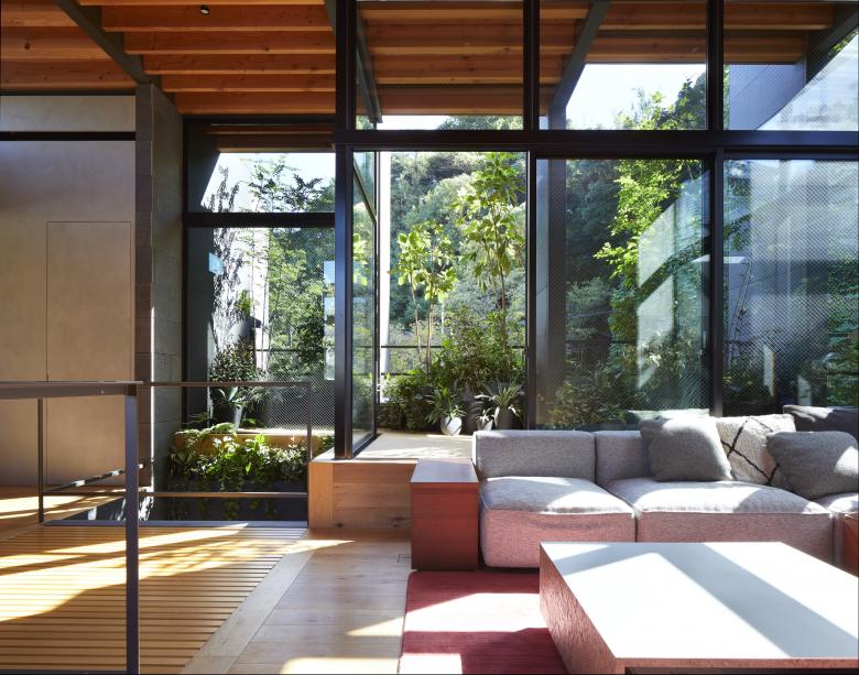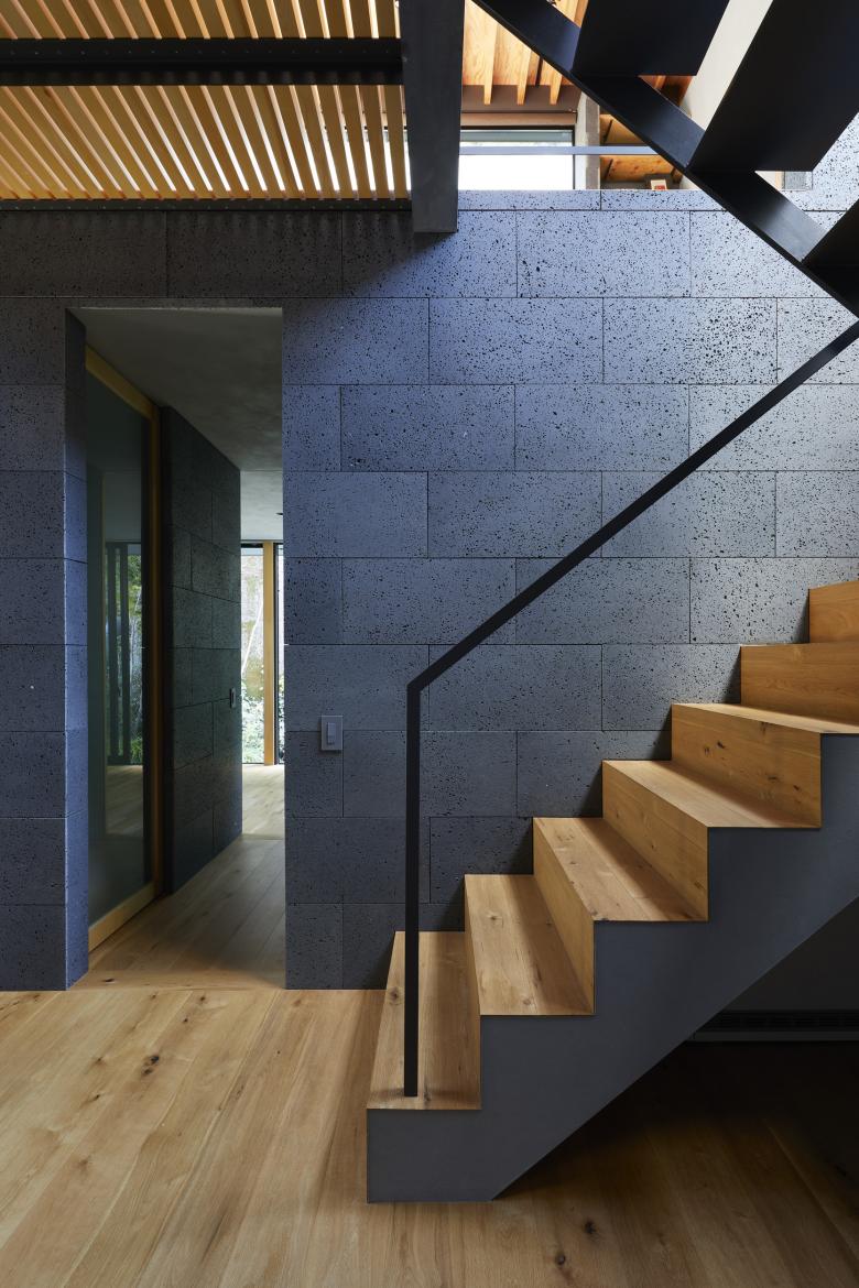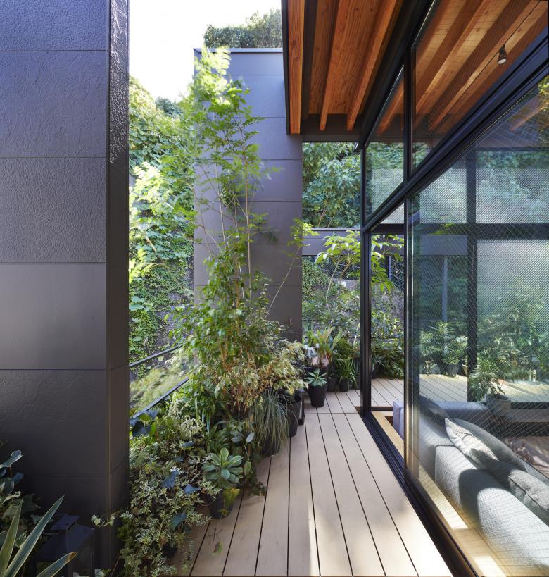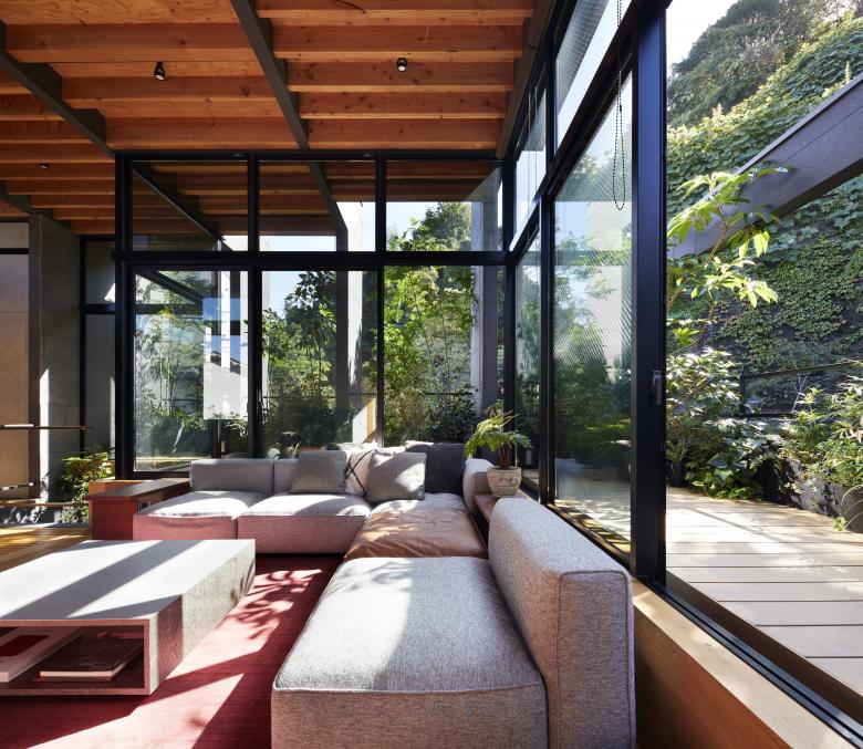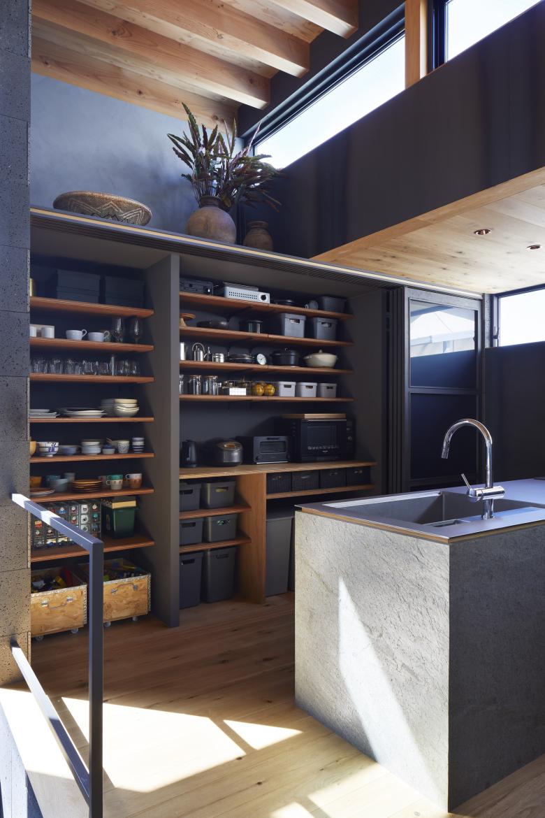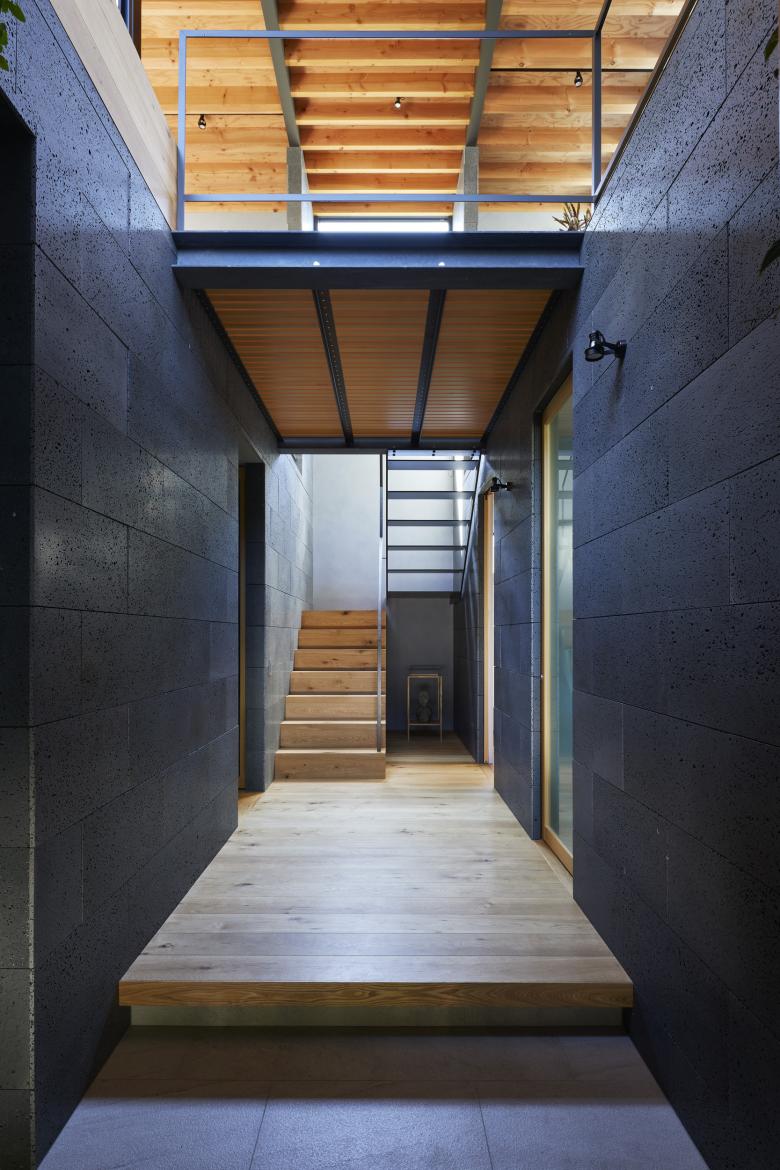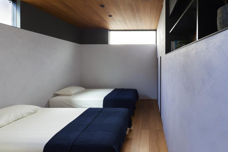 The second floor is the main family gathering space, and a semi-outdoor space filled with plants was defined as a "tsuginiwa," or garden that connects the environment and the architecture at the boundary between the interior and exterior. By setting the garden 4m above the ground surface, the garden overlaps horizontally with the lush greenery in the distance, creating a landscape with depth. The tangen garden is extended to the southeast to allow light to penetrate to the trees, creating a geese-path shape with different depths, and the bearing wall is placed in parallel to the garden to modulate the sunlight and the line of sight from the neighboring land. The exterior form of the building, which is intricate with the tangen garden, overlaps with the view to the southwest of Mt.
