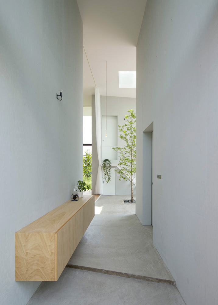 岐阜県揖斐郡大野町で計画した住宅。富有柿の産地として有名なこの地域。その柿畑の一部を計画地にされたいとオファーをいただいた。建物は天井高が高く開放的な空間を希望されたため、7本の太い柱のようなBOXの上に大屋根を乗せたような構造とし、プライバシーを必要とする空間は柱の中、すき間の空間はLDK空間として大きくガラス面を確保した構成とした。開放感を得ながらも外部からは柿の木によってプライバシーは保たれ、内部は落ち着いた空間を確保している。柿の季節による変化に応じて様々な風景を生じながら、あたかも柿に守られているような豊かな住空間になったのではないかと考ている。