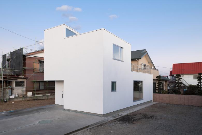 この不安を解消すべく様々な配置を検討した。最終的に道路側に3台分の駐車場を設け、残りの敷地に間口いっぱいのボリュームを配置し、将来にわたって南からの採光を担保するため、真南に開口が対するよう2段階でカットした。敷地の角度に沿ったプランに対して異なる角度でボリュームが切られることで、この住宅の中心として位置付けられる吹抜けに動きが生まれた。俯瞰的な視点で行った操作が、アイレベルでは意図不明な形態に収斂したようにも思える。