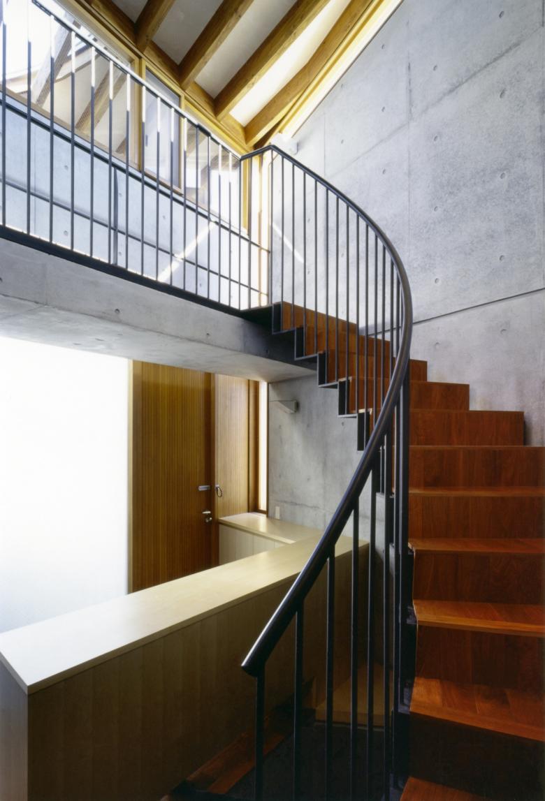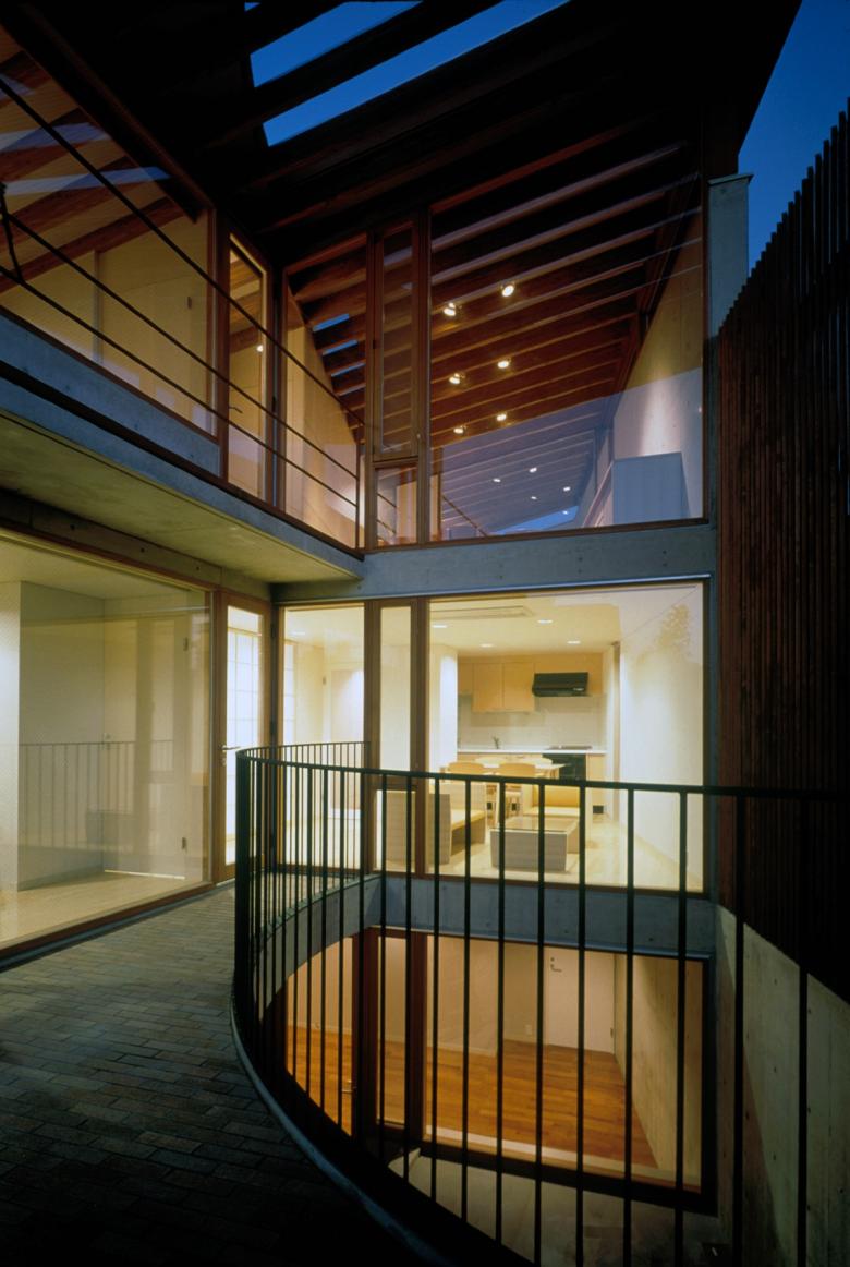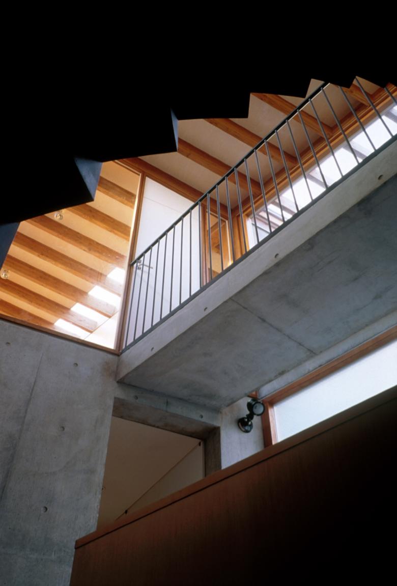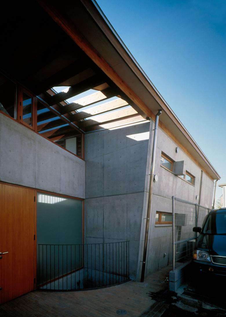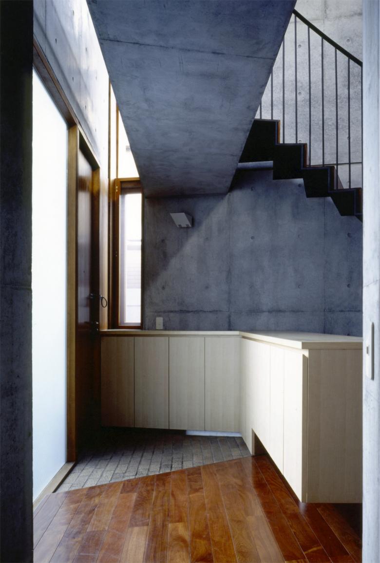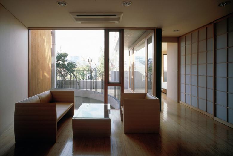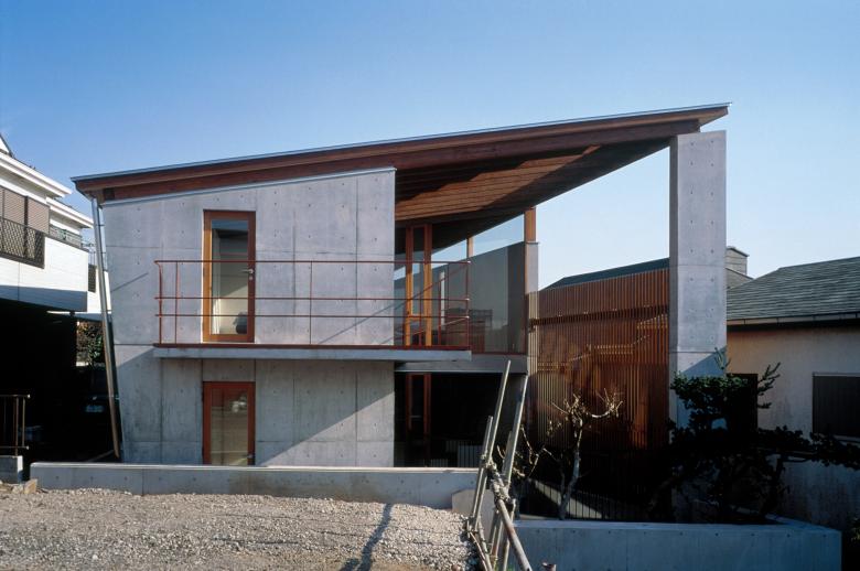 This house was planned on a high ground named Fujimidai in northwest Tokyo. The narrow, irregularly shaped site borders a 4-meter-wide road on the northeast and features a south-facing cliff approximately 3 meters lower than the adjacent property.
