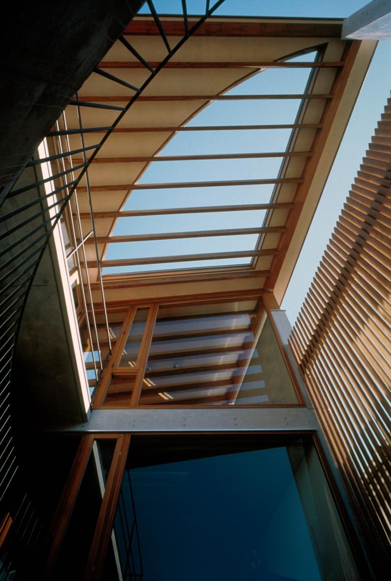 Located within a densely built-up residential area and constrained by the site's elevation differences, the structure was designed as a three-layer cross-section comprising a basement level that also functions as a retaining wall and two above-ground floors. The floor plan is divided into three distinct zones: east, west, and central. External spaces are created on the northeast and southwest sides, actively incorporating the external landscape into the interior spatial composition. The structure employs reinforced concrete walls from the basement to the second-floor level, topped by a single-slope roof supported by glued laminated timber beams. The entire site is uniformly covered by beams of identical cross-section. By exposing these beams both internally and externally, the design aims to unify the spatial experience across the entire site. On the east and south elevations, the roof is detached from the walls and floats above them. Holes are cut into this roof, allowing light to stream through the gaps between the beams into the garden and interior spaces, so that the varied light of the sun, from sunrise to sunset, can penetrate the interior over the course of the day.