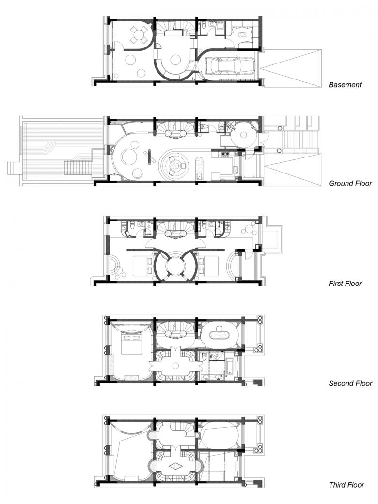 Four principal adjusts were made to the original spatial layout. The first was to combine the redundant part of garage with scattered surrounding spaces to constitute a hub of the floor underground and, in the meantime, to provide mass storing space for considerable belongings of the client and her children. Secondly the extra high space between two girls’ bedrooms on the second level was shaped into an intimate activity space, a tiny castle co-owned by the little princesses. Then a partial fourth level was extended in the extra high center of the third floor, satisfying privy storage needs in further. Finally the staircase was reformed with transparent showcases into an elegant and winding lengthwise channel running through all the five levels of the house.