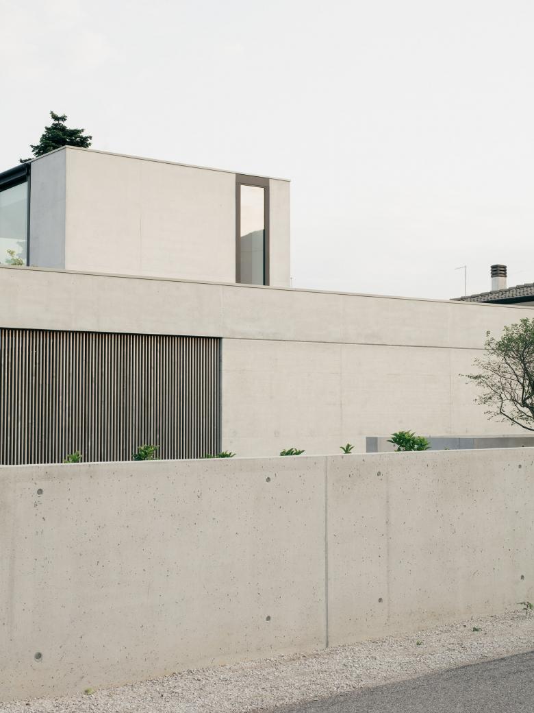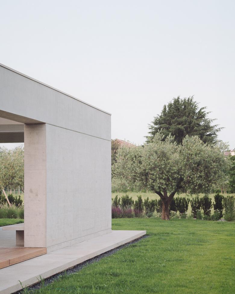 L’area di progetto, situata ai piedi delle Alpi trova verso nord un’interessante vista dell’imbocco della Valsugana, tra il versante ovest del Monte Grappa (da poco patrimonio dell’UNESCO) e il versante est dell’altopiano di Asiago, mentre a sud, sopra le chiome di un lungo uliveto, si può? scorgere il centro storico di Bassano del Grappa. L’idea di partenza è stata quella di catturare nel basamento dell’edificio parte del verde presente attraverso delle corti. La prima corte si trova nella zona di ingresso e la seconda che da verso il giardino. Questo elemento architettonico si declina in due diverse funzioni: diventa filtro visivo nella zona di ingresso, per allontanare gli sguardi indiscreti dei passanti e inquadratura verso l’esterno nella zona del giardino e dell’uliveto. In mezzo al tetto verde fa capolino un piccolo volume semplice dove trova spazio uno studiolo che si apre su una piccola terrazza panoramica.