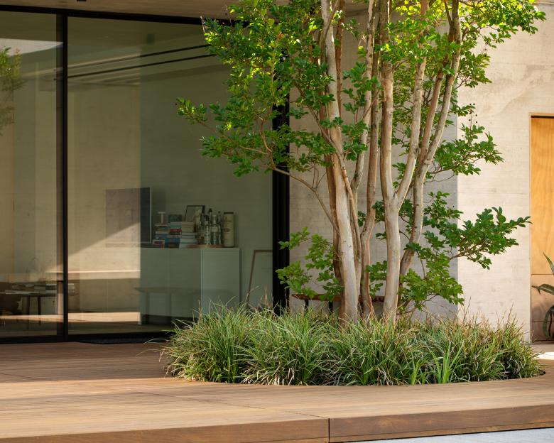 Dalla strada l’edificio appare chiuso, la vista verso l’esterno e? filtrata da un separe? di doghe di legno a creare un effetto “vedo non vedo” per conferire la giusta privacy ai proprietari.