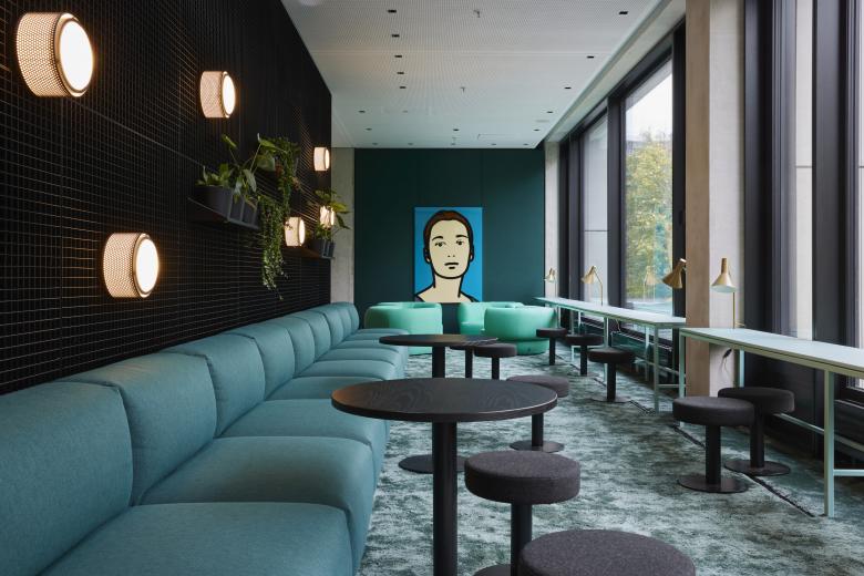 In den zum Atrium hin offenen Büroetagen hat HENN Interior Orte der Begegnung für unterschiedliche Arbeitssituationen definiert, die Menschen virtuell, aber insbesondere wieder persönlich zusammenbringen: An den lebendigsten Teil, rund um die innenliegenden Atrien, schließen sich großzügige Teeküchen und Räume für kollaboratives Arbeiten, informelle Meetings und Präsentationen an. Ganz außen, geschützt durch die Wände der Meetingräume, schließen sich die ruhigeren Arbeitsbereiche der einzelnen Agenturen an – sowie Fokusräume, Telefon- und Videomeetingboxen. Obwohl die Etagen weitgehend ohne Trennwände auskommen, sind kommunikative Bereiche und fokussiertes Arbeiten in nächster Nähe möglich – dank schallabsorbierender Wand- und Deckenpaneele sowie schwerer Filzvorhänge.