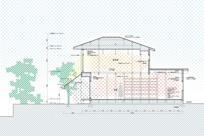 家全体に光と熱と風を留めたり流したりする事を考え、南北に抜ける大きなリビングと上部に空気の塊を配置した。その空気の塊からの光や熱を調整するために、リビングと空気の塊の水平の境界にグレーのドットを施したアクリル板を挿入した。同様に外部と内部の媒体として、アルミエキスパンドメタルの庇を南側の庭に設置した。庇は自然光を反射し空気の塊を一層明るくし、逆に1階に直接入る光を粒状に変えて抑える。