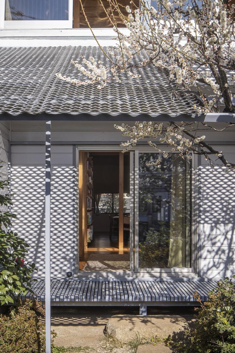 エキスパンドメタルの庇は既存のファサードも一変させた。庇が加わることによって、複数の要素が混在していた立面が統合されたように感じられたのだ。今回新たに加えたものと既存住宅とは異なるリズムでありながら、ひとつの統合されたポリリズムとして成り立っている。ポリリズムとしての住宅が、様々なものが混在する街のポリリズムにも参加することを目指した。