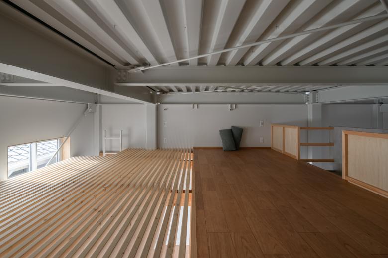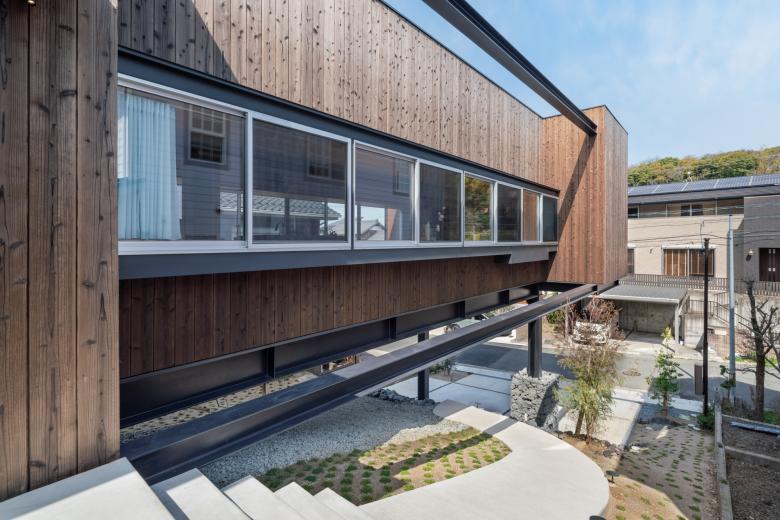 登っていく斜面地に建てる場合、敷地の傾斜に合わせ段々に床をつくっていく形式が多かったように思う。今回の建ち方は、崖上に入口があり斜面は行かない場所とする懸造のような形式と似ているが、入口は崖の低い方にある点で逆転している。斜面地に向き合う新しい解法であり、地上から開放された地の上に建つ住宅となった。