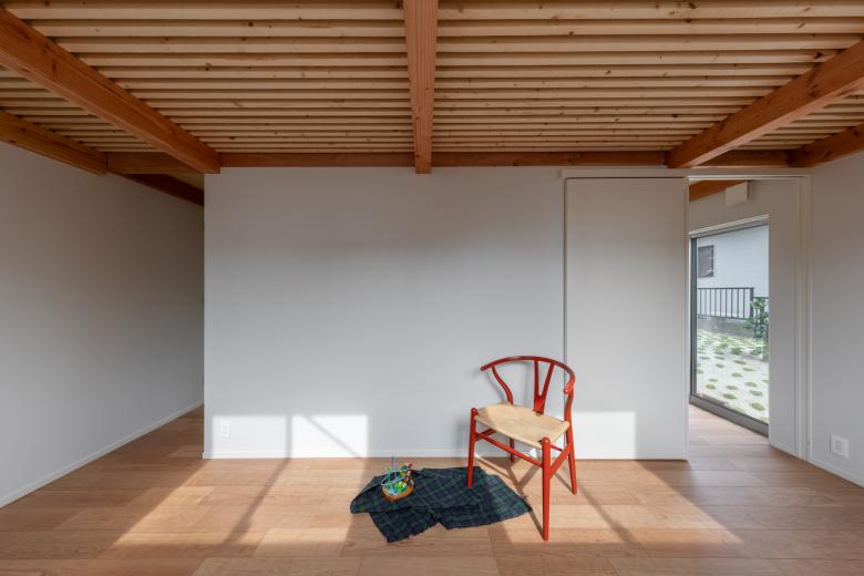 そこで、畑だった特徴を活かし高低差をおおよそそのままに住宅をもち上げた。地上をピロティと緑化の場所にし、地上に水平の広がりを獲得している。玄関は敷地奥に配置し、緑化された場所を通らなければいけない。庭だと荒れていても気にならないかもしれないが、毎日通る道であれば手入れもしたくなるだろうし、ピロティであれば天候問わず子供と遊びたくなるかもしれない。