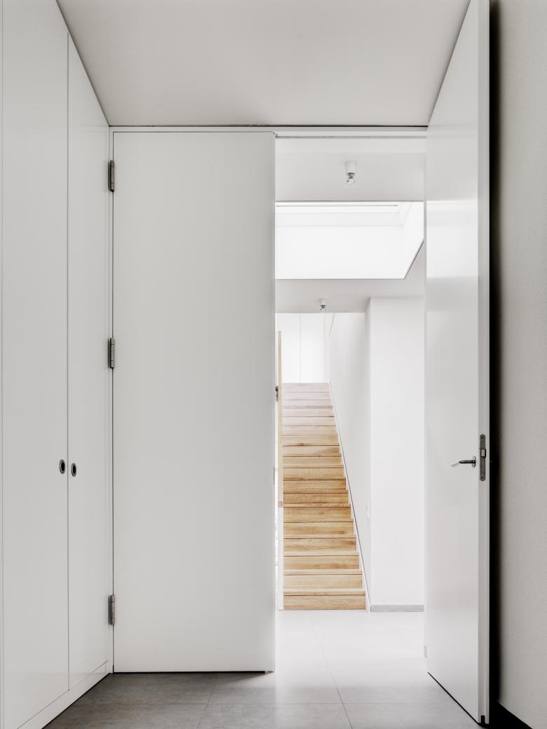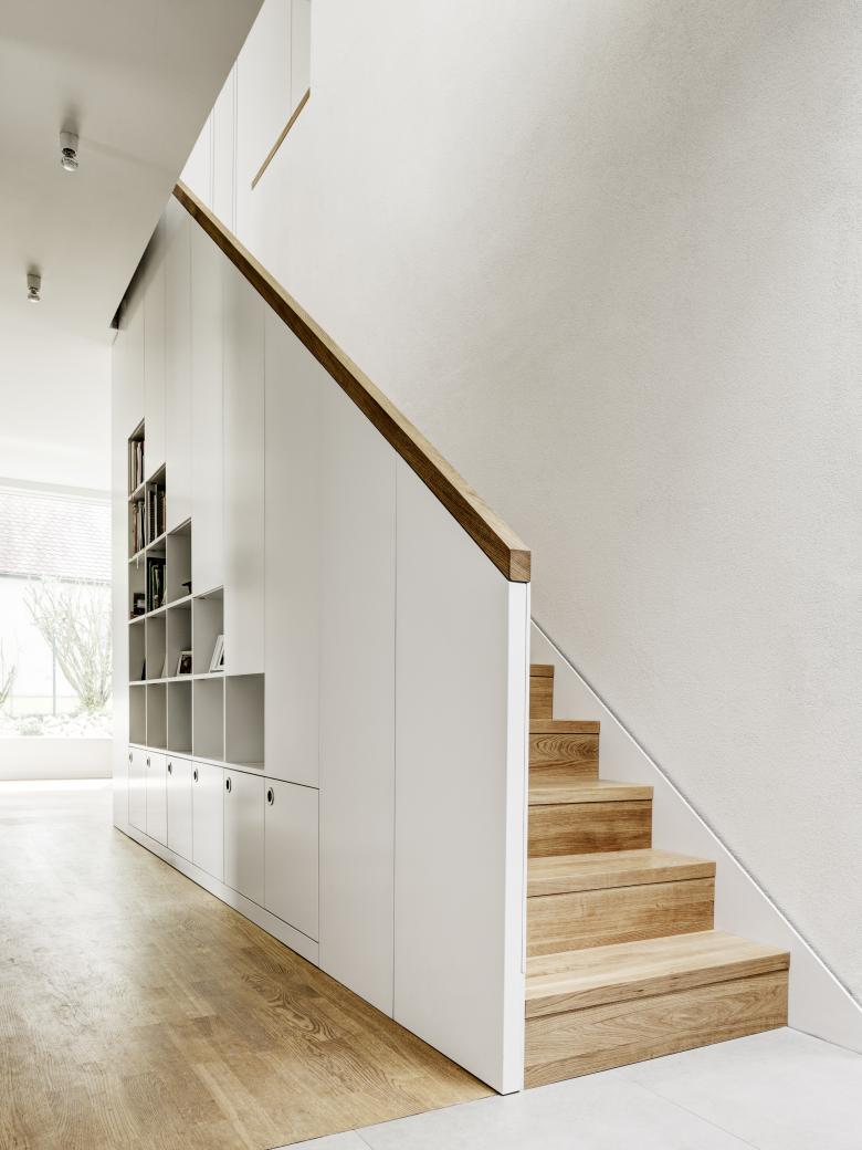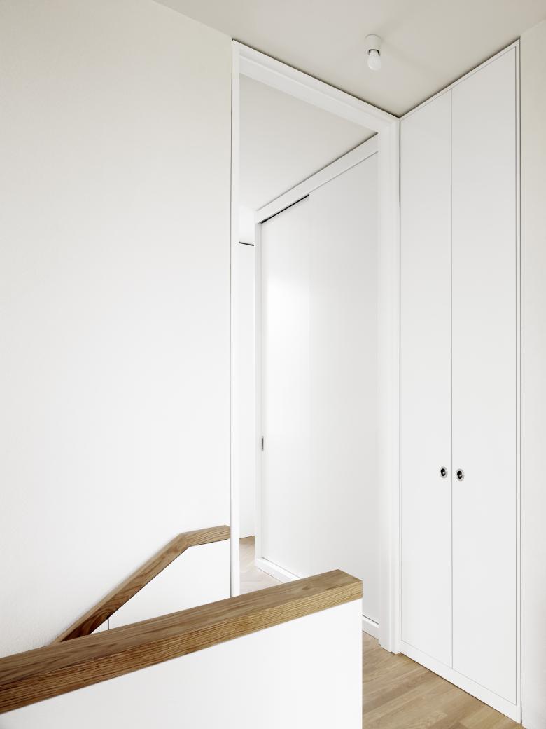 Vom Flur aus gelangt man über eine offene Wohntreppe in das Obergeschoss mit den privaten Räumen, Elternschlafzimmer mit Ankleide und Bad, zwei identische Kinderzimmer für die beiden Zwillinge. Einbaumöbel bieten auf allen Etagen genügend Stauraum.