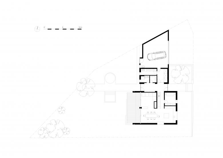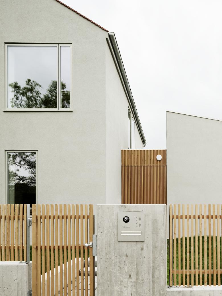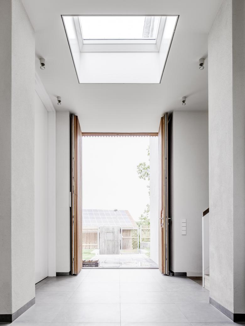 Die Wohnfläche wurde für eine vierköpfige Familie konzipiert und optimiert, der Grundriss des Haupthauses ist kompakt und effizient. Im Erdgeschoss befinden sich die Gemeinschaftsräume, Flur, Essküche und Wohnzimmer, Arbeitszimmer, Gästebad, Kammer und Hauswirtschaftsraum. Die große Doppelgarage ist direkt vom Haus aus begehbar. Der Flur ermöglicht ein Durchschreiten des Hauses von Ost nach West, von der Straße über den Vorgarten in den rückwertigen nach Westen orientierten Garten.