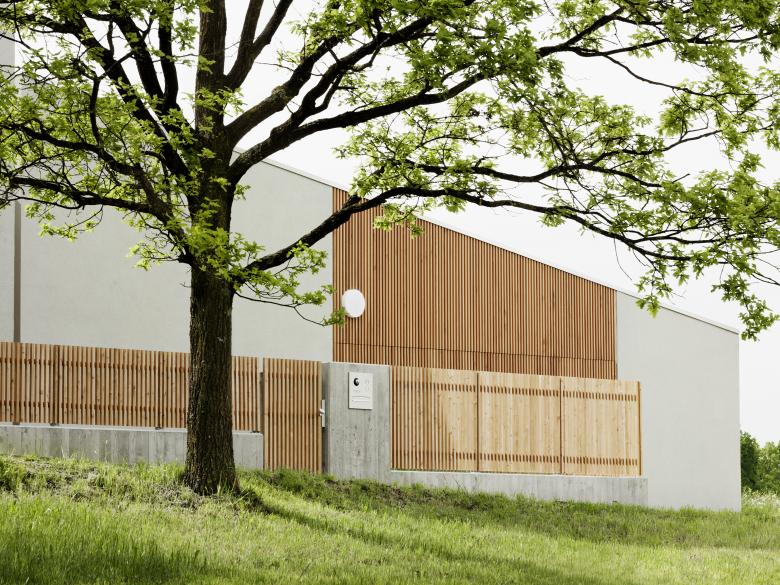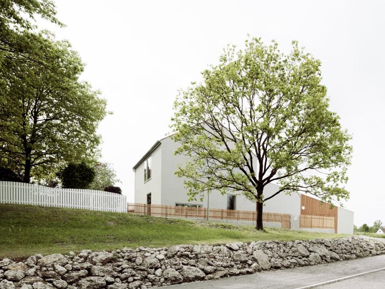 Das Haus entstand auf einem Hanggrundstück in Randlage eines Neubaugebietes. Wir konnten die Bauherren bei der Auswahl Ihres Grundstücks beraten, die Wahl viel auf ein zwar schwierig geschnittenes Grundstück, dass aber durch die Randlage in einem gewachsenen Kontext der bestehenden Nachbarbebauung steht und von den schönen alten Bäumen vor dem Grundstück profitiert. So konnte die schwierige Situation von Neubaugebieten, Baustellen, keine gewachsene Grünanlage, Neubau an Neubau, vermieden werden.