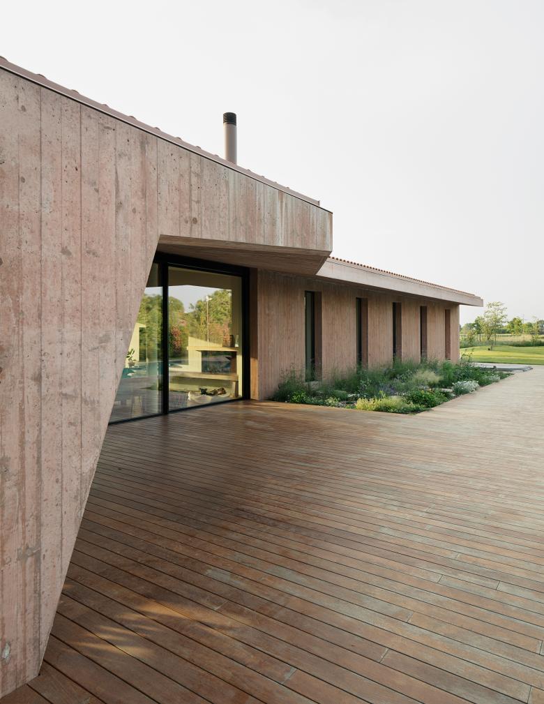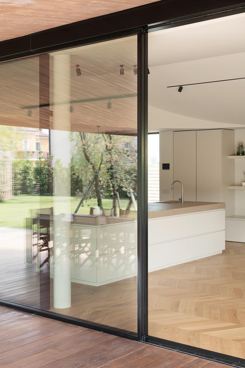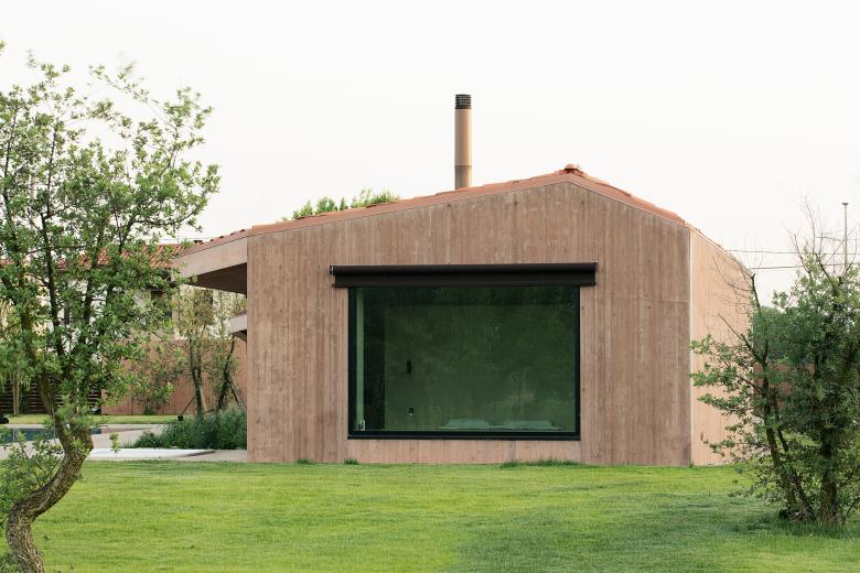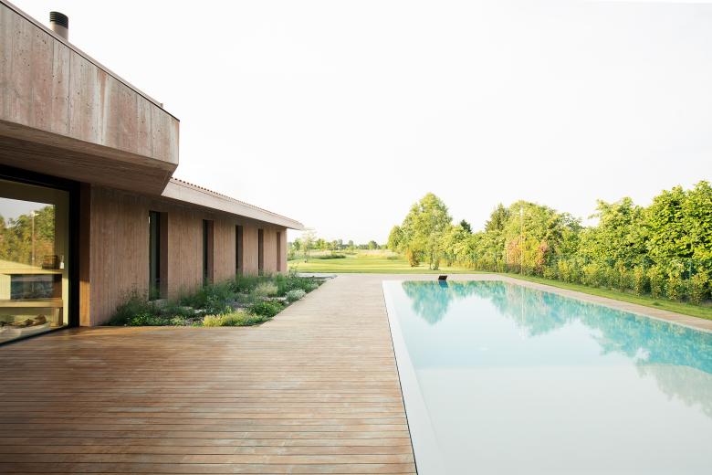 Al fine di creare un portico di connessione tra la zona living e la piscina, la falda di copertura subisce una dilatazione controllata, seguendo la sua inclinazione naturale.