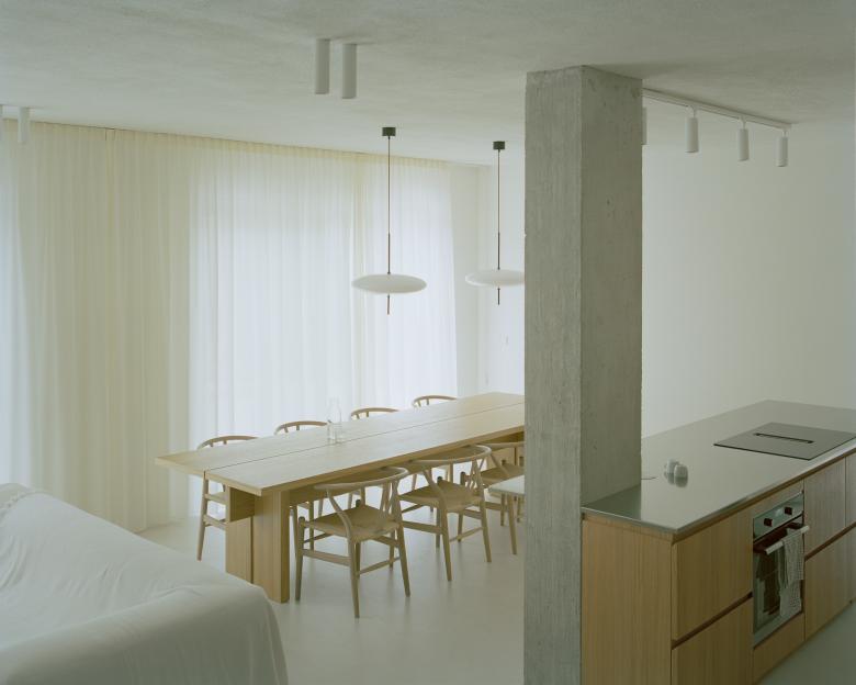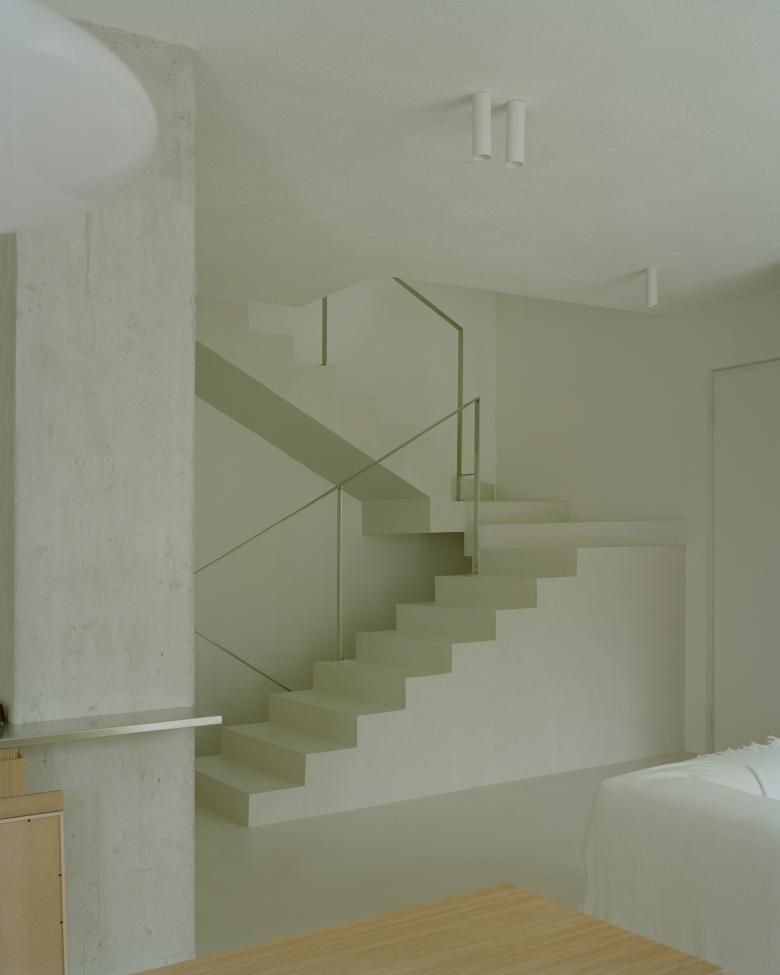 The interior layout favors open, fluid spaces, reducing partitions to a minimum. The living area is conceived as a continuous environment, articulated solely by the service core, which serves as a backdrop for the open kitchen. The existing staircase was freed from its original enclosing walls and reimagined as a sculptural and lightweight element, emphasized by a slender stainless steel handrail.