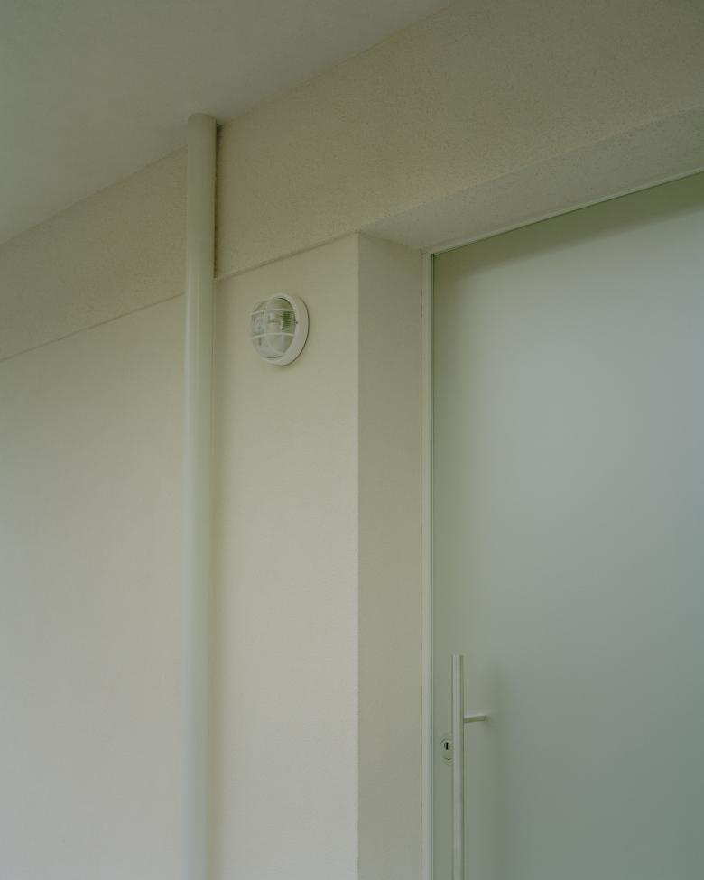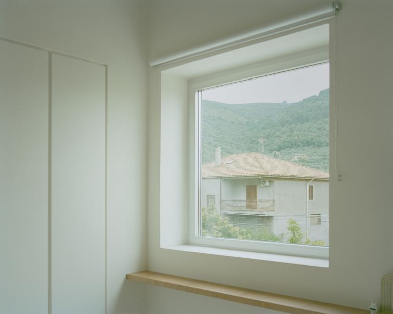 rarefied appearance. The alternation of different textures and slight setbacks around the openings creates a play of shadows and surfaces, subtly defining a thin, essential stringcourse.