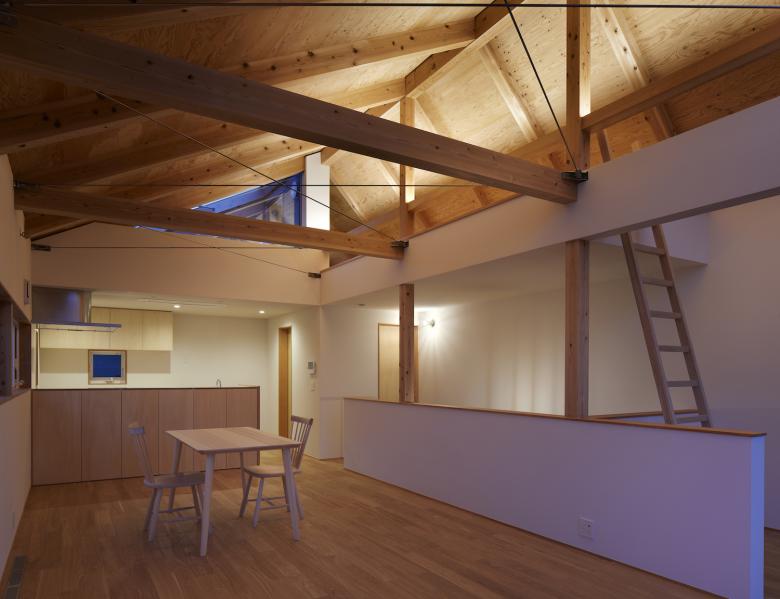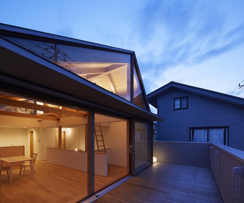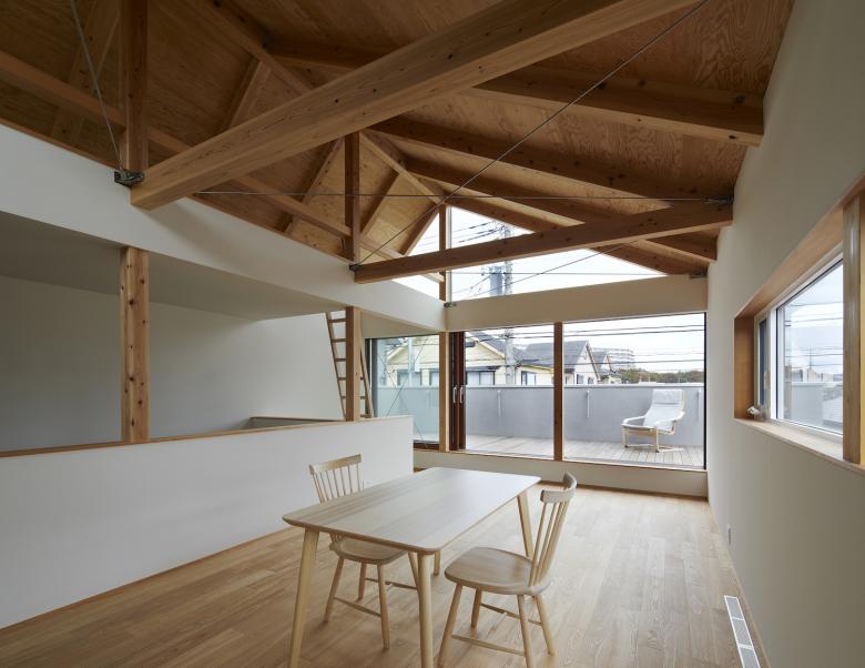 二階は北に対して大きく開かれており、住み手は大窓を開け放つことで、空中に浮かぶ庭=「宙庭(そらにわ)」へと連続した暮らしを描き出すことができる。この「宙庭」からは北に広がる畑風景と街並みを見下ろすことができるが、道路からは内部の生活を伺うことが出来ないよう、腰壁高さが工夫されている。