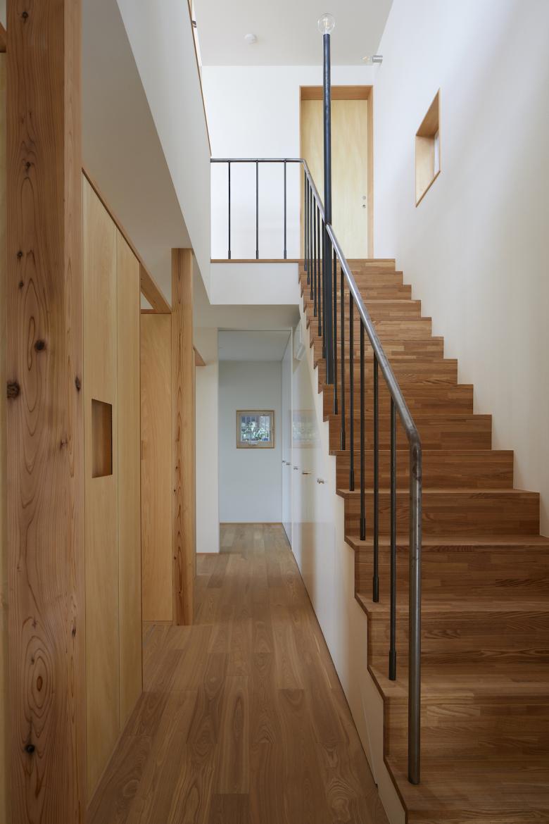 上下階をつなぐ階段の横に吹抜けを設けることで、住まい全体がひとつながりの空間となることを意識し、家中の何処に居ても家族同士がお互いの気配を感じられる様に計画した。