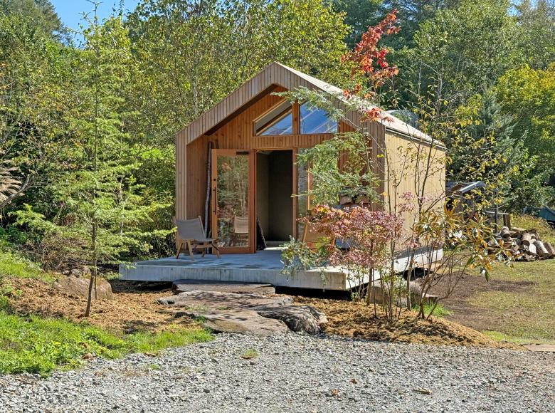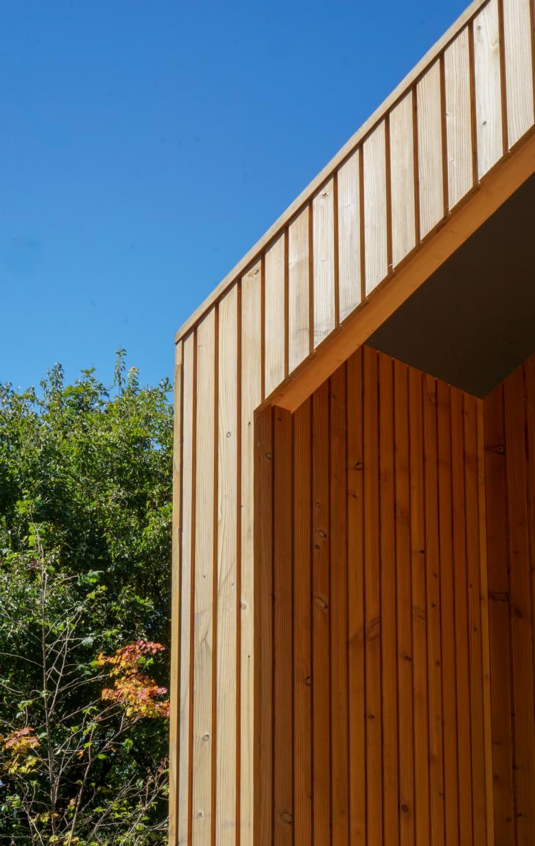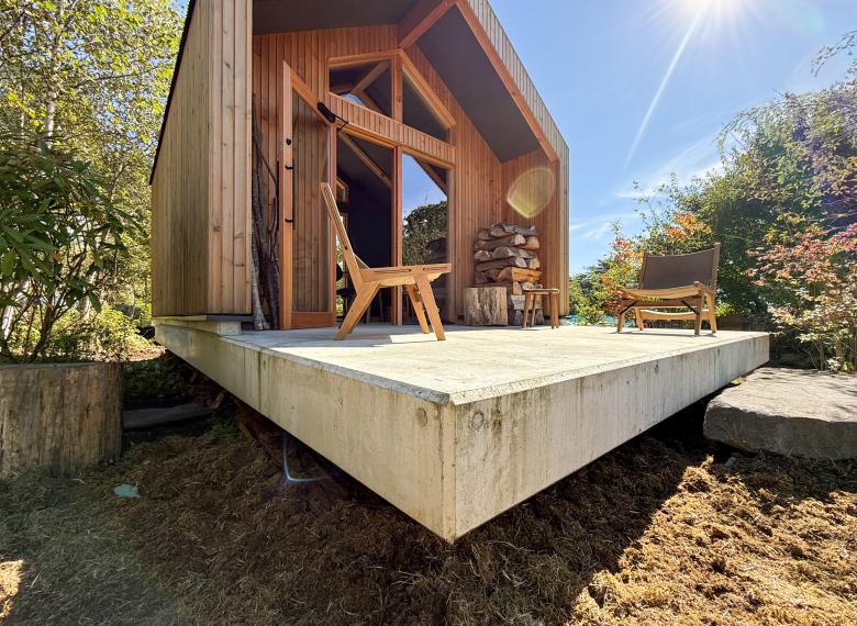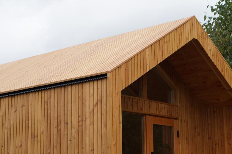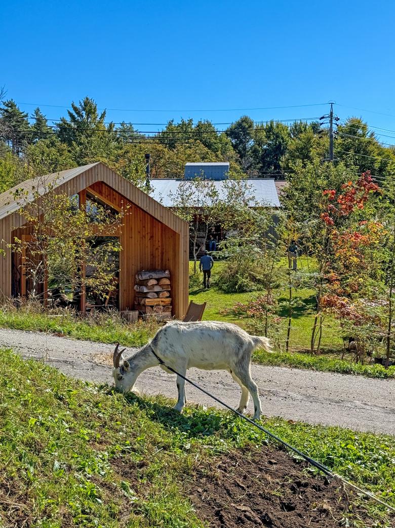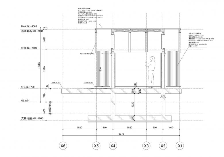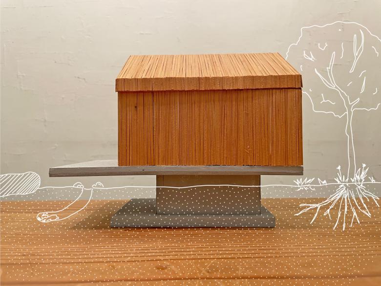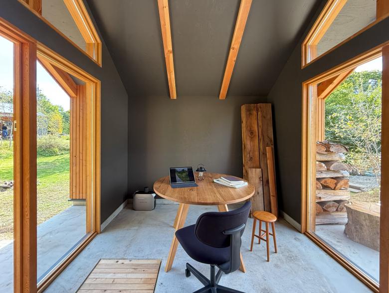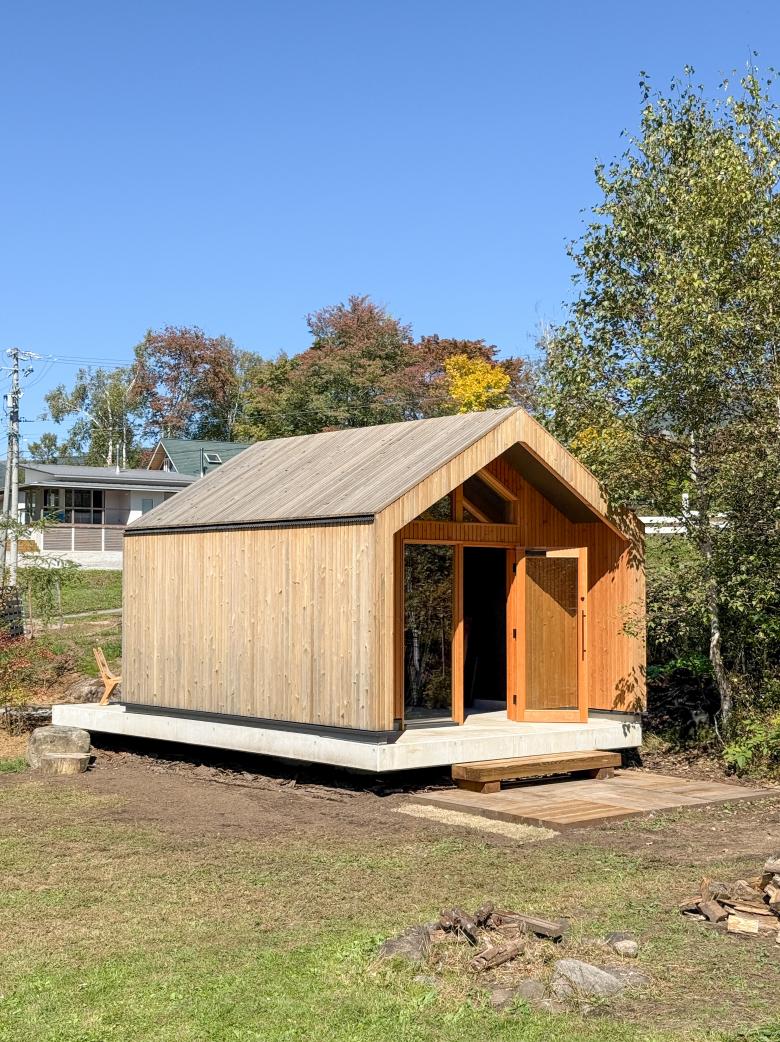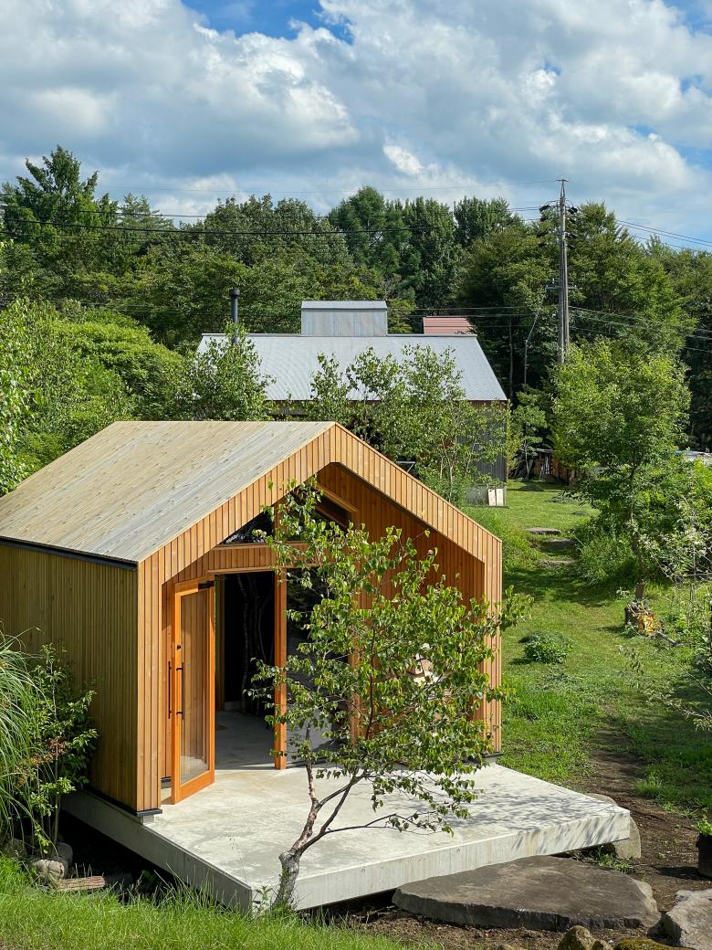 「ウキゴヤ」の敷地は、長野県茅野市の標高1100m付近に位置する2018年に竣工した「ペッタンコハウス2」の庭先です。施主は同じく植栽家・ランドスケープデザイナーであり、建物の用途は「地域の立ち寄り場兼事務所」として、そしてゆくゆくは更に増築させて「ペッタンコハウス2」からの移住も妄想されています。約6畳の小さな木造空間は、一本足のような基礎で浮き上がり、四周においてランド(土地)との縁を切り離しました。縁を切ることから生まれる、ランドスケープとの新たな関係性を重要視しています。またコンパクトな基礎は凍結深度が深い当該エリアにおいては、コスト削減と直結します。屋根と外壁材は「ペッタンコハウス2」でも使用した地元カラマツのサイディング材です。屋根下地はガルバリウム小波板で、外壁下地は耐久性の高いドイツ製の防水シート。屋根と外壁の施工は施主が自ら丁寧に行いました。給排水も電気も引き込まれていない、完全なオフグリッドな建物です。