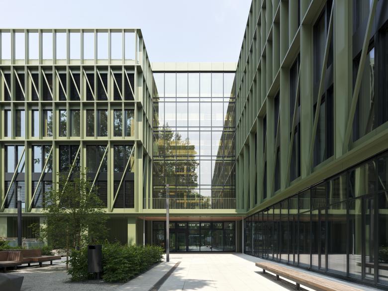 Maßgeblich für die warme, offene Atmosphäre im Inneren des i8 ist das Material Holz, genauer gesagt: Baubuche aus deutscher, nachhaltiger Forstwirtschaft. Insgesamt speichert das verbaute Holz über 2.300 Tonnen CO2 und trägt so positiv zur Klimabilanz bei – und es ist nicht nur im Tragwerk zu sehen, sondern auch in der großen Freitreppe, die auch zum Versammlungsort werden kann. Neben dem Atrium als kommunikativem Zentrum für die verschiedenen Nutzer, gibt es flexibel gestaltbare Arbeitszonen für jegliche New-Work-Wünsche. Die Außenhaut des i8 besteht hingegen zur Hälfte aus recyceltem Aluminium, das mit seiner grünen Farbe die Industriegeschichte des Ortes aufgreift. Wie zukunftsträchtig das Gebäude ist, zeigt auch das Nutzerinteresse – schon vor der Eröffnung war es voll vermietet.