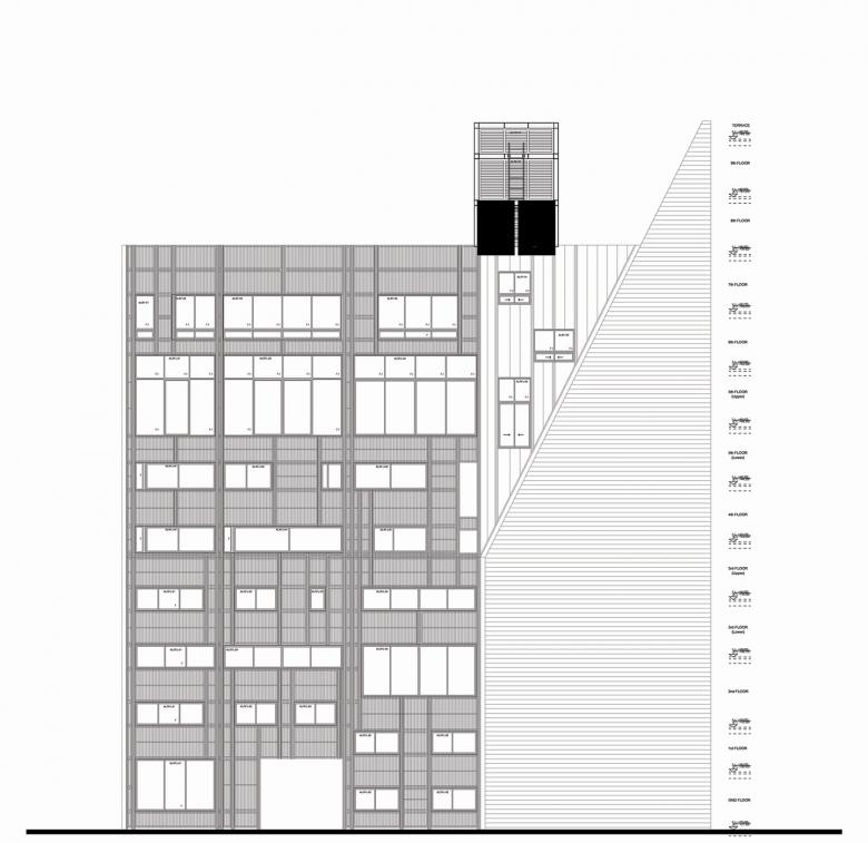 Every residence is developed around a different section, providing each apartment with high ceilings in the reception areas. All apartments feature a split level and / or double level section. The façade of the edifice is designed to accommodate to and compose with the variations in its openings, all of which are a consequence of the differences in plan and section of all the residences within the building; whereas the envelope of the edifice is shaped by the maximum allowable volume on its site. Facades are finished in solid wood sections mounted on modular aluminum frames.