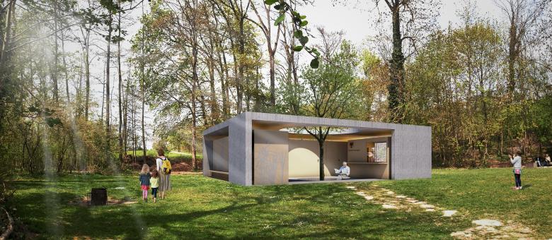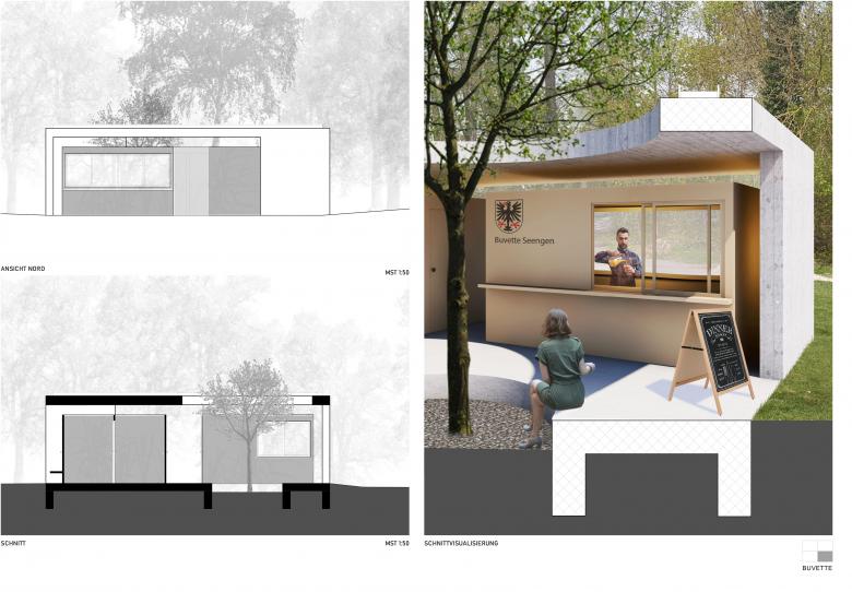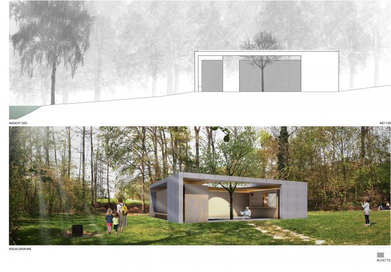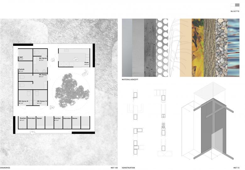 Der pavillonartige Baukörper gliedert sich im hinteren Teil der Parzelle. Er nimmt die Besucher vom bestehenden Weg, welcher durch die Bäume führt, in Empfang. Das Objekt ist von drei Seiten her zugänglich und öffnet sich zur Liegewiese hin. Der Besucher kommt seitlich am Gebäude an, wo sich der Kiosk befindet. In das Innere gelangt er über einen Durchgang, welcher ihn in den offenen Innenbereich führt. Dieser dient als Drehscheibe und erschliesst alle öffentlichen Nutzungen wie Umkleide-/ Duschkabinen, Toilettenanlagen oder den Kiosk. Die massive, aus Beton bestehende Hülle, widerspiegelt die Standhaftigkeit eines Schlosses und gibt dem Besucher Schutz. Die Infrastruktur wird in leichten, abgekoppelten Boxen, als Skelettbau unter die massive Konstruktion gestellt. Der grosse Ausschnitt in der Mitte des Gebäudes, öffnet die Sicht nach oben und bringt Licht und Luft ins Innere. Die Buche holt die Natur ins Zentrum und lässt das Innen mit dem Aussen verschmelzen.